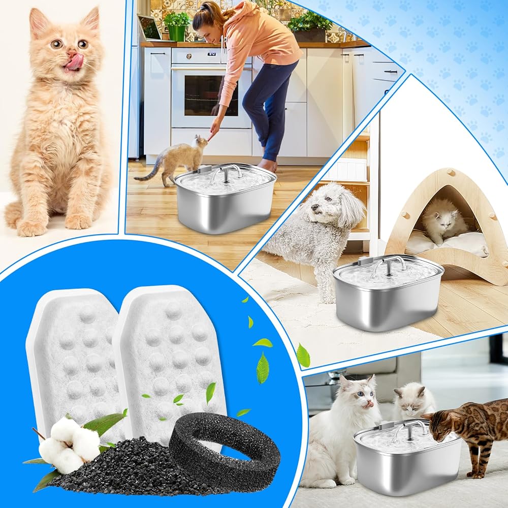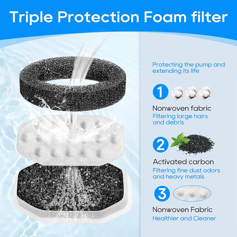 💦This cat fountain filter uses triple filtration. The sponge foam filter could well filter the hair and dirt, the high-density cotton layer. The activated carbon will help you filter out hair and other debris, most impurities and heavy metals while removing odors.