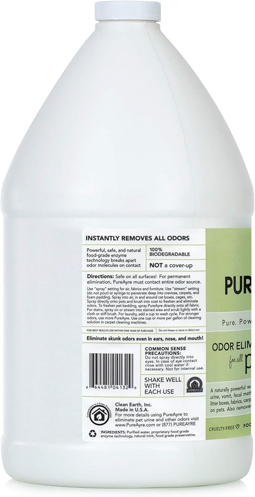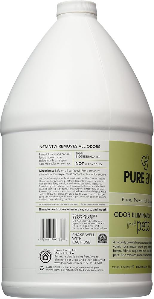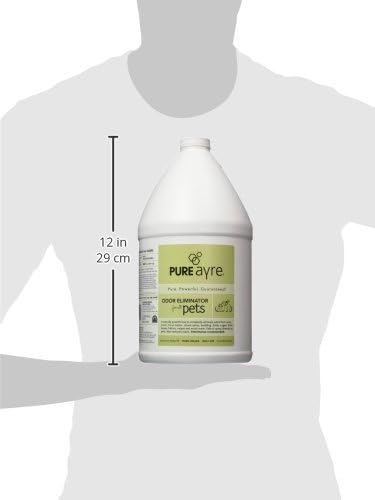 Pure Ayre is the only odor eliminator on the market today strong enough to tackle the worst animal odors like cat urine and skunk, yet safe enough to spray directly on people and pets. Safe even around birds and those with allergies and sensitivities. Food grade safe. A naturally powerful way to completely eliminate odors from urine, vomit, fecal matter, skunk and cat spray, bedding, birds, cages, litter boxes, fabrics, carpets and much more. Also removes stains. Veterinarian recommended. Refill bottle. 1 gallon. Made in United States.