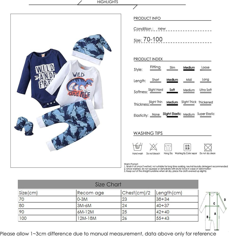 Camidy 5Pcs Baby Boy Clothes Dinosaur Long Sleeve Romper Top+ Pants+ Hat+ Gloves Infant Spring Outfits Set 0-12 Months