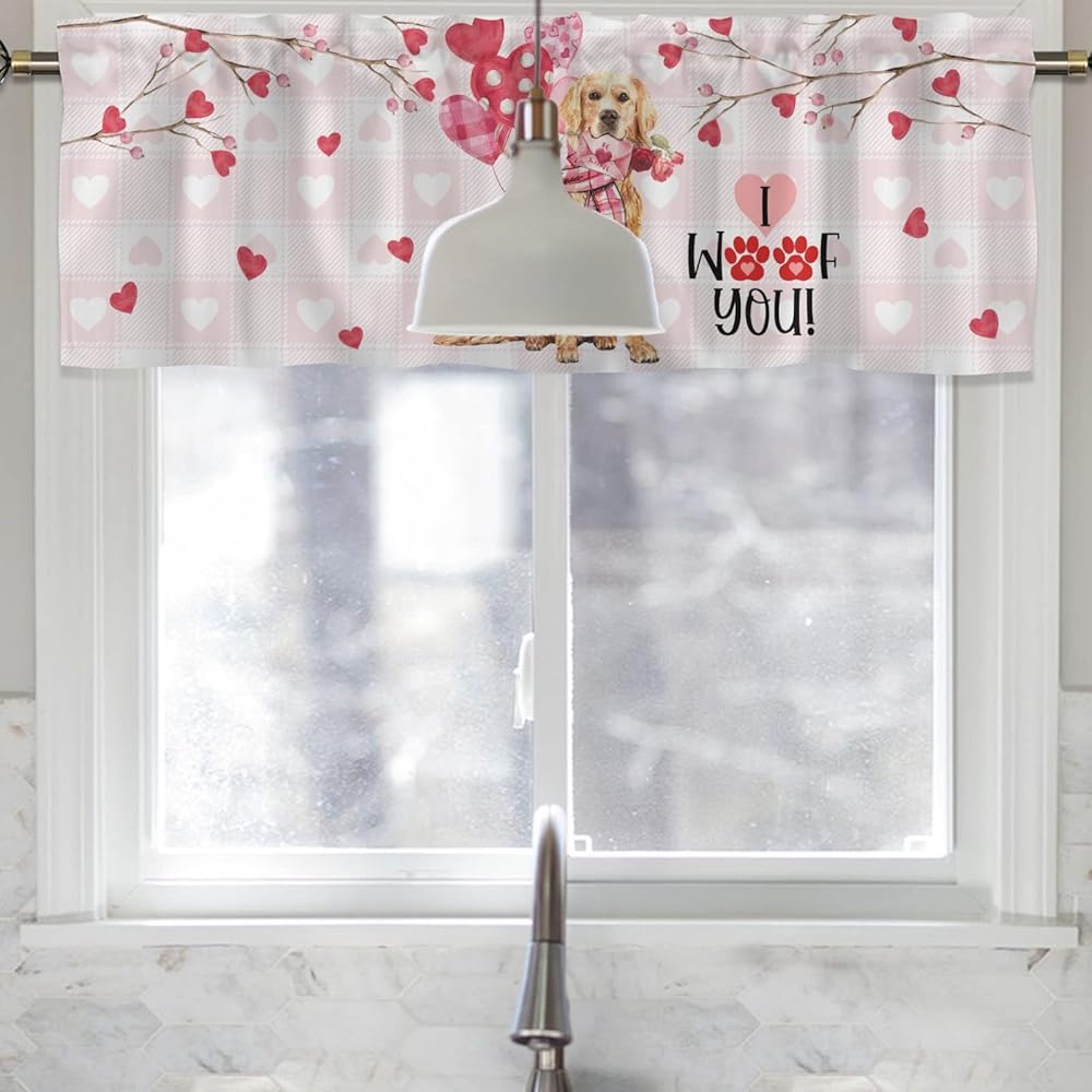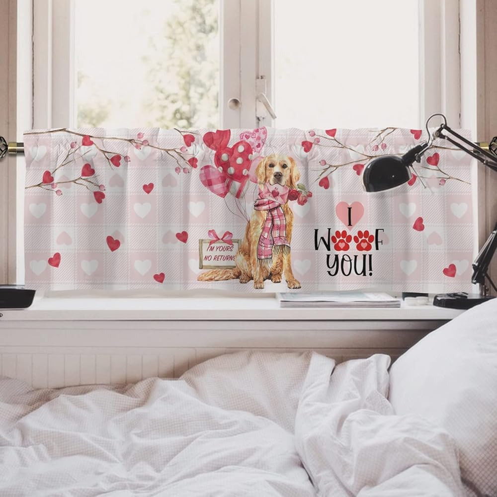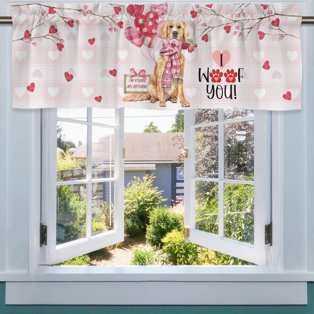 Kitchen Window Curtain: Measures 54 x 18 Inches (137 x 45cm) for 1panel. Our Happy valentine's day funny golden retriever ‘be mine i woof you I'm yours no returns' sign valentines love letter 'I woof you I'm yours no return' valentine heart tree branches balloon valance curtains with rod pocket on top, fit well with standard or decorative curtain rods. Our kitchen half window curtains are made of durable polyester fabric with classic colorful patterns, these valances are light filtering and allow a bit of light to still come through