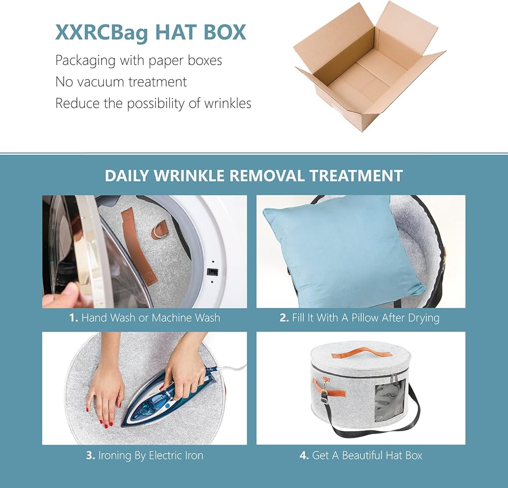 💓 New Way of Packaging: We put the hat box into a cardboard box to protect the hat box from pollution, so just open the product will have a slight deformation as well as creases, you can first put the hat box into the washing machine and wash it once, then dry it, then iron it, or send it directly to the dry cleaners, which can effectively remove the creases.