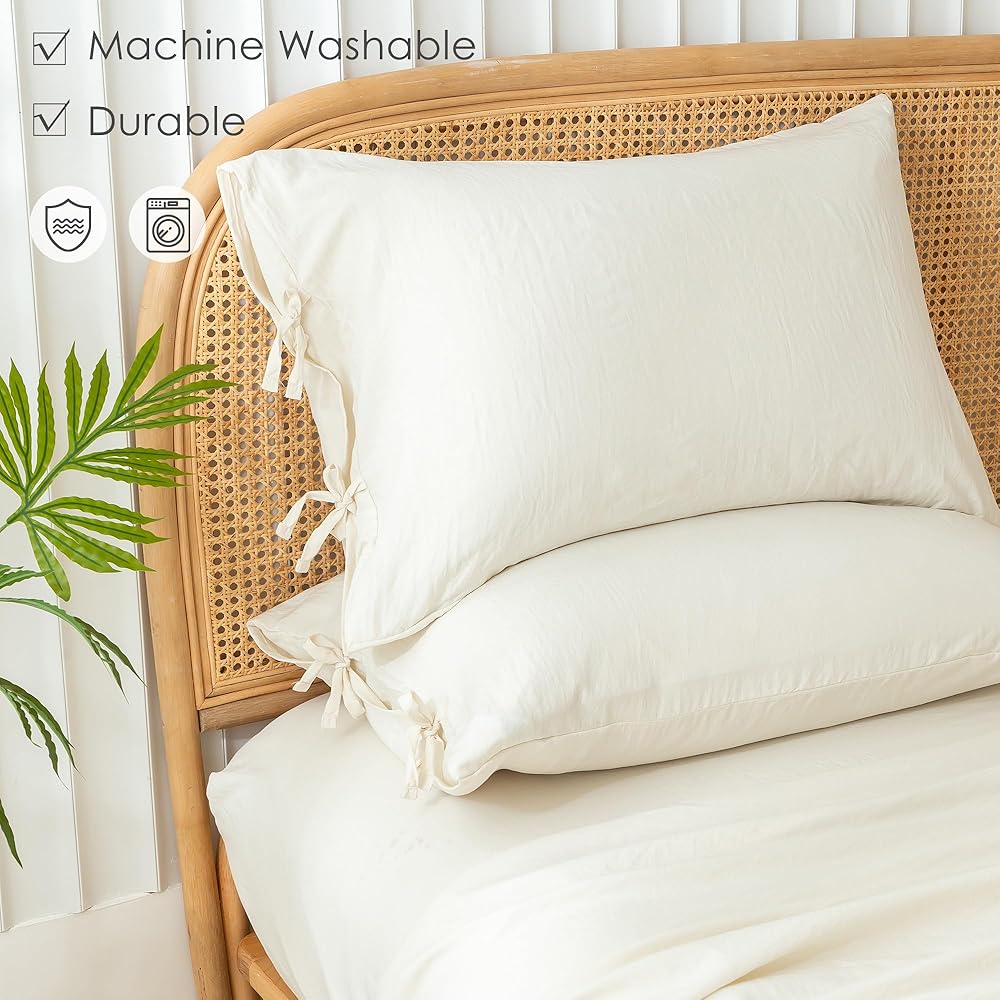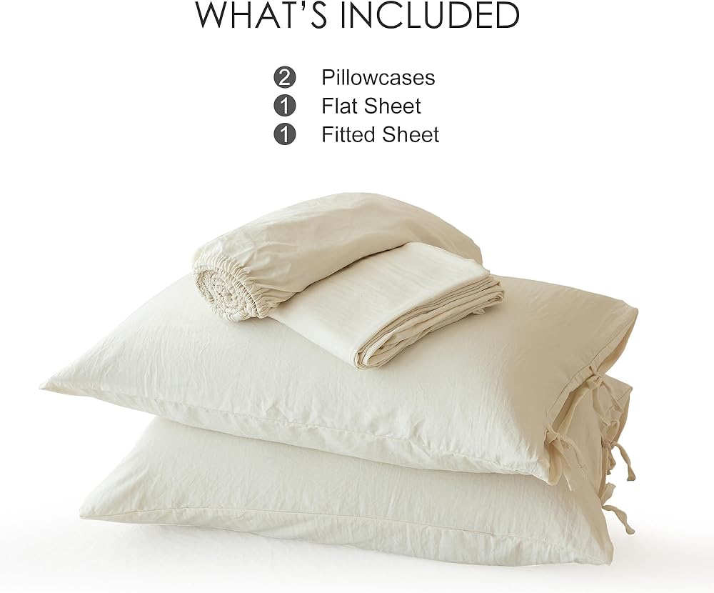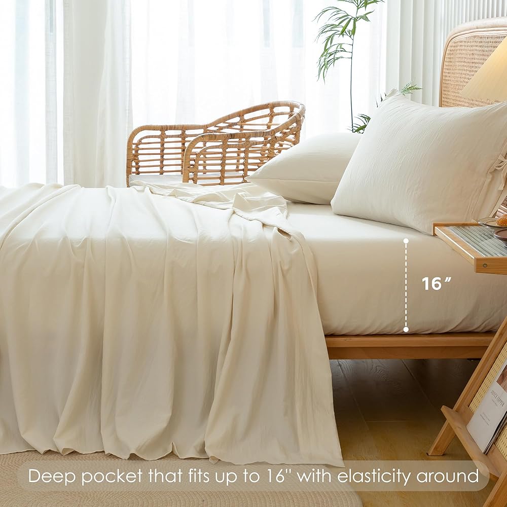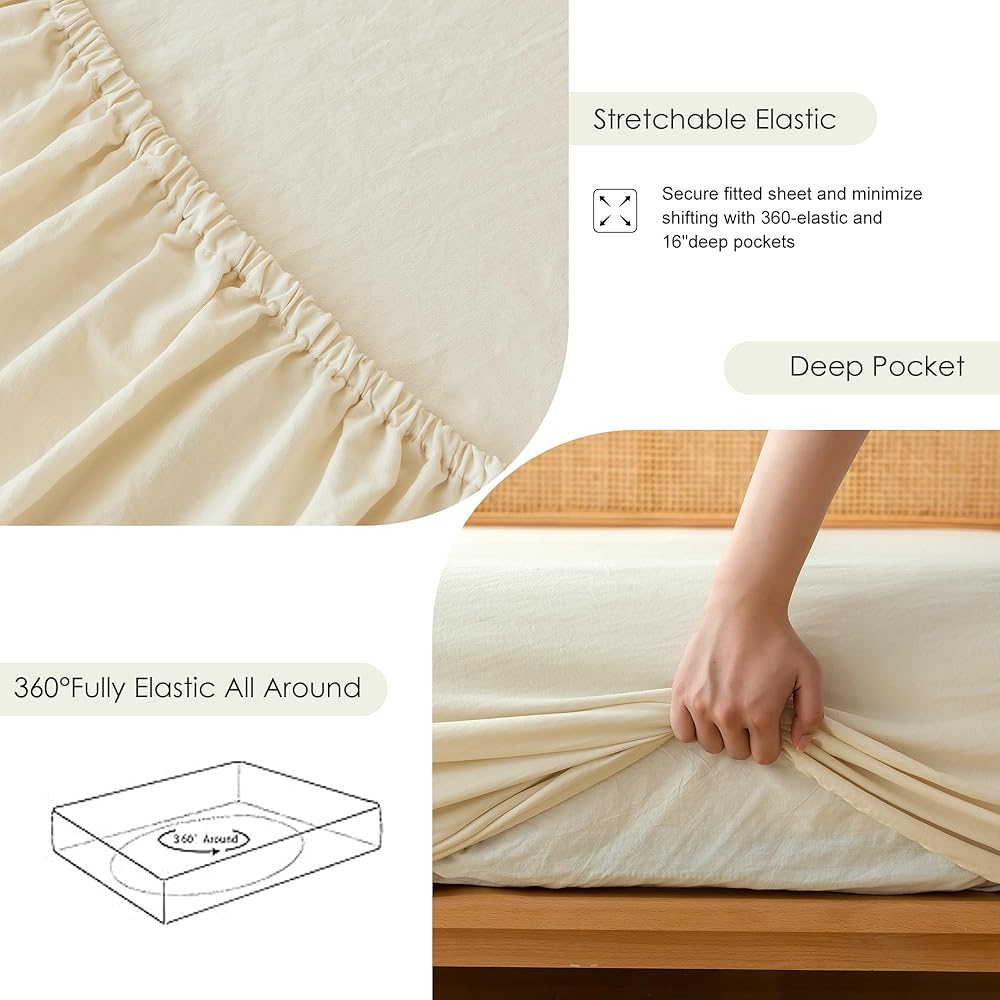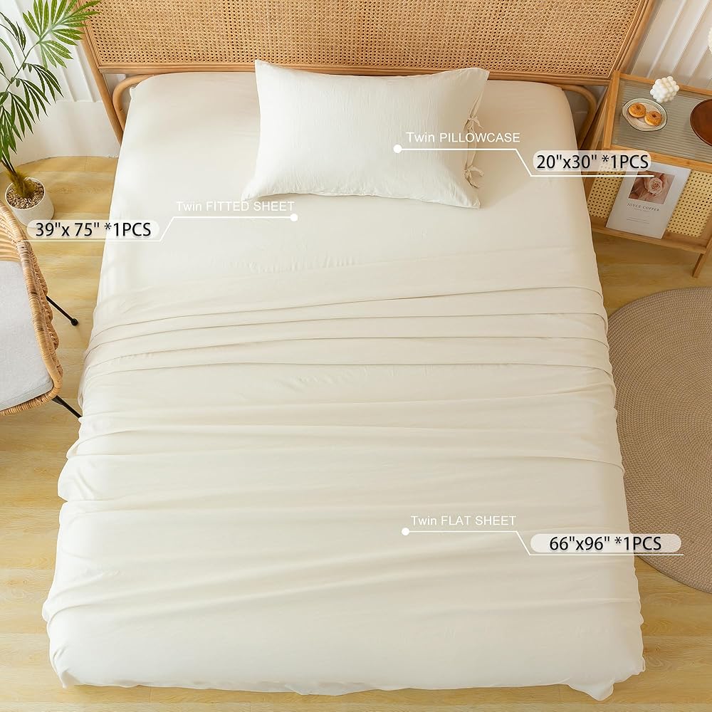 COTTEBED Washed PolyCotton Twin Sheets Sets Clearance, Ultra Soft Bedding Set, 3 Piece Breathable Vintage Durable Deep Pockets Bed Fitted Sheet Up to 15" for All Seasons Boy Girl Teen Dorm Ivory Beige