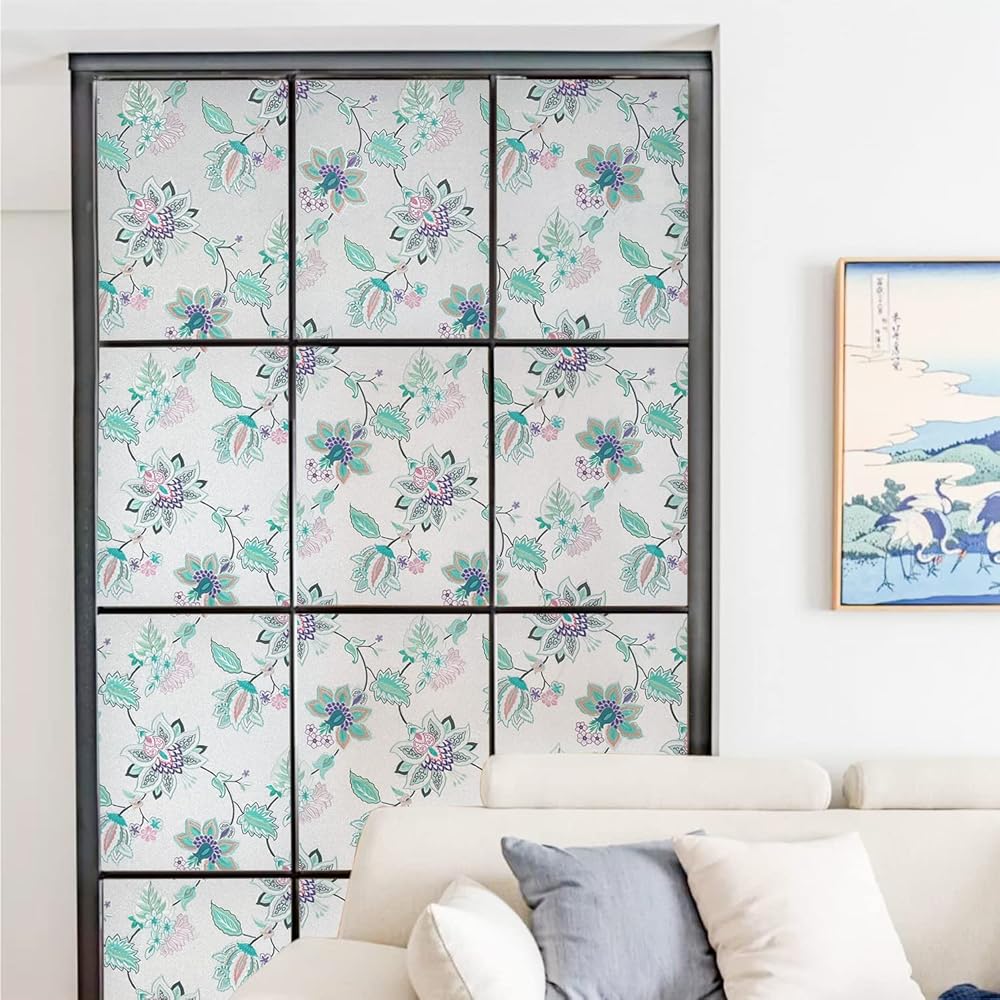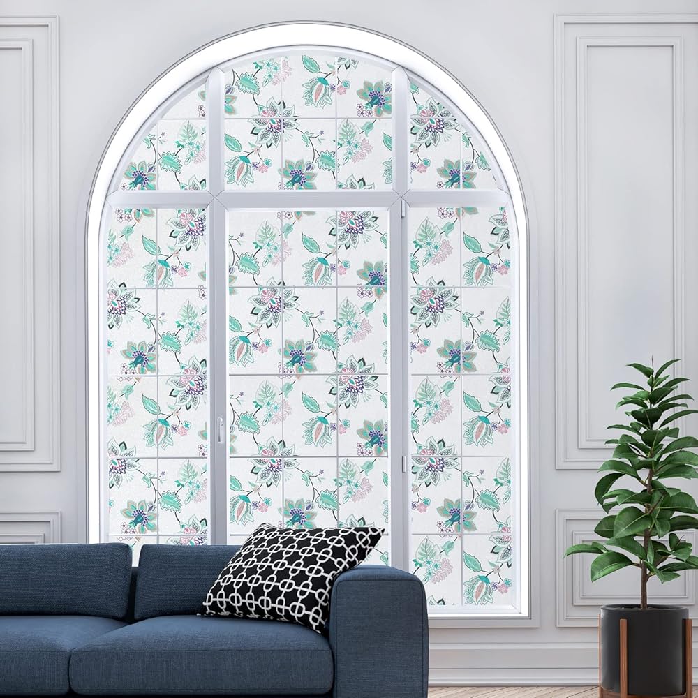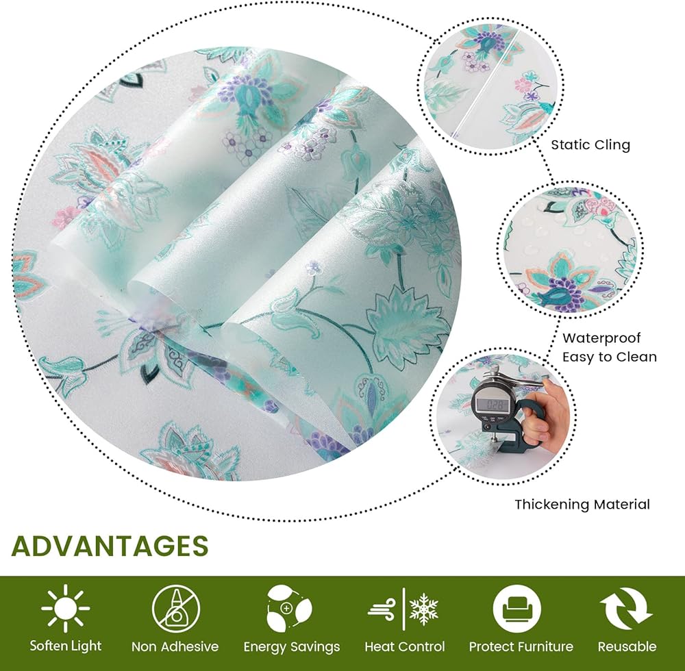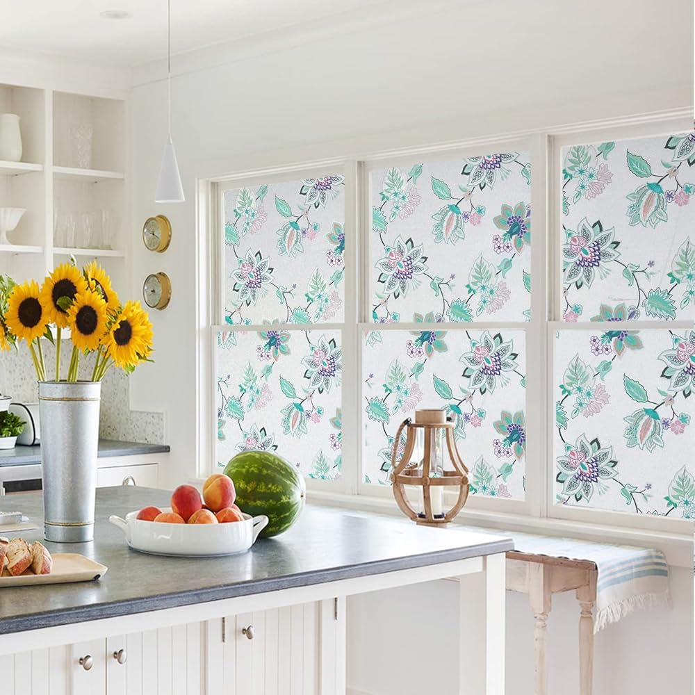 DKTIE Stained Glass Window Film with Installation Kit - Non Adhesive Static Cling Removable, Retro Floral Pattern, Privacy Protection, Softened Light (17.7" x 78.7", F)