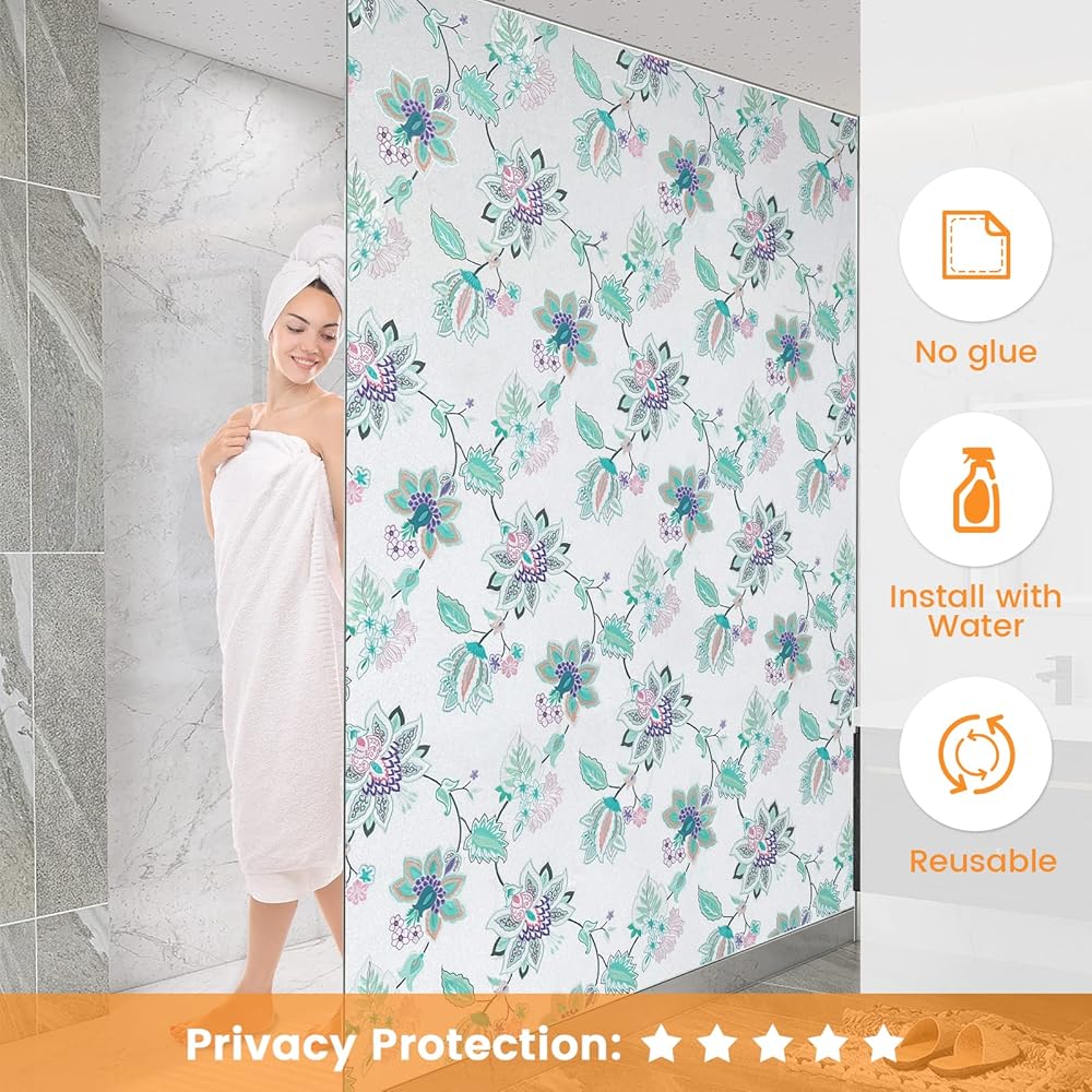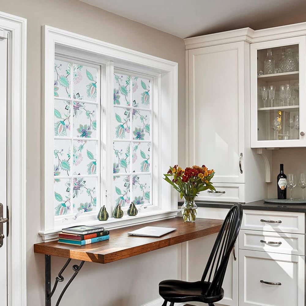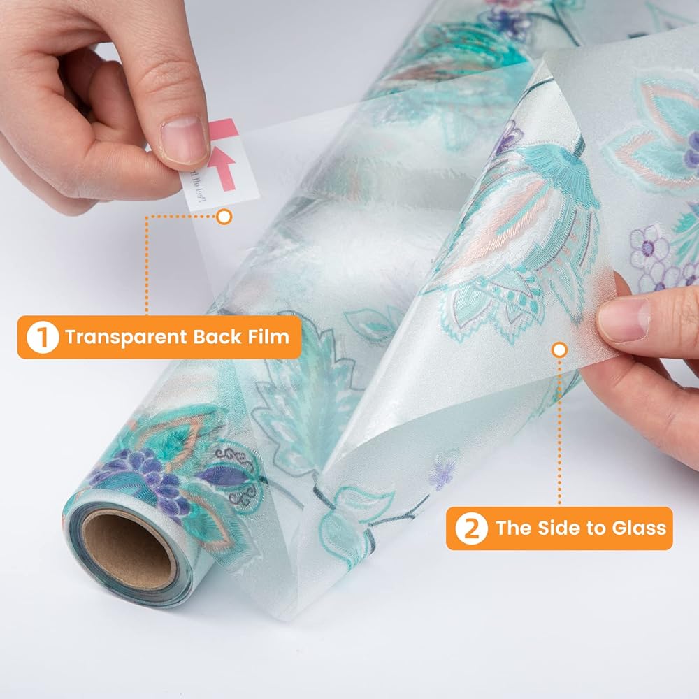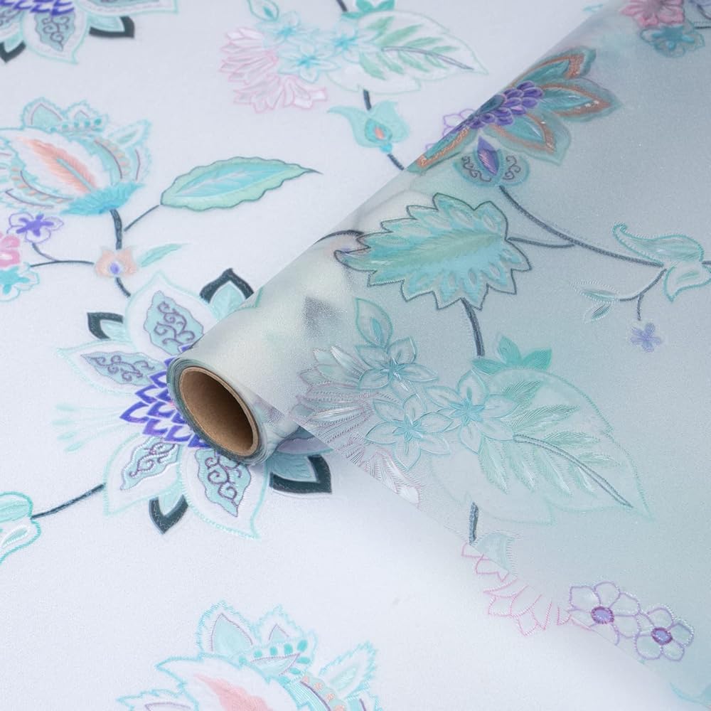 DKTIE Stained Glass Window Film with Installation Kit - Non Adhesive Static Cling Removable, Retro Floral Pattern, Privacy Protection, Softened Light (17.7" x 78.7", F)
