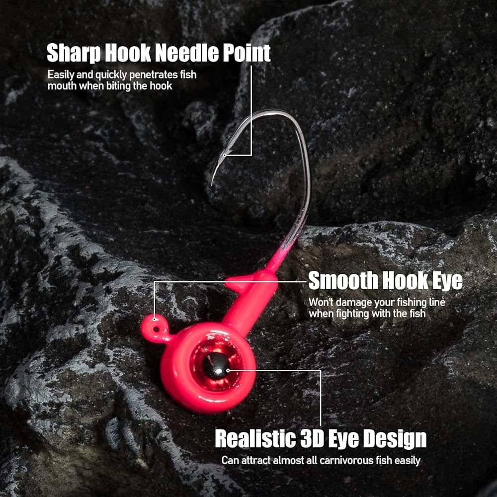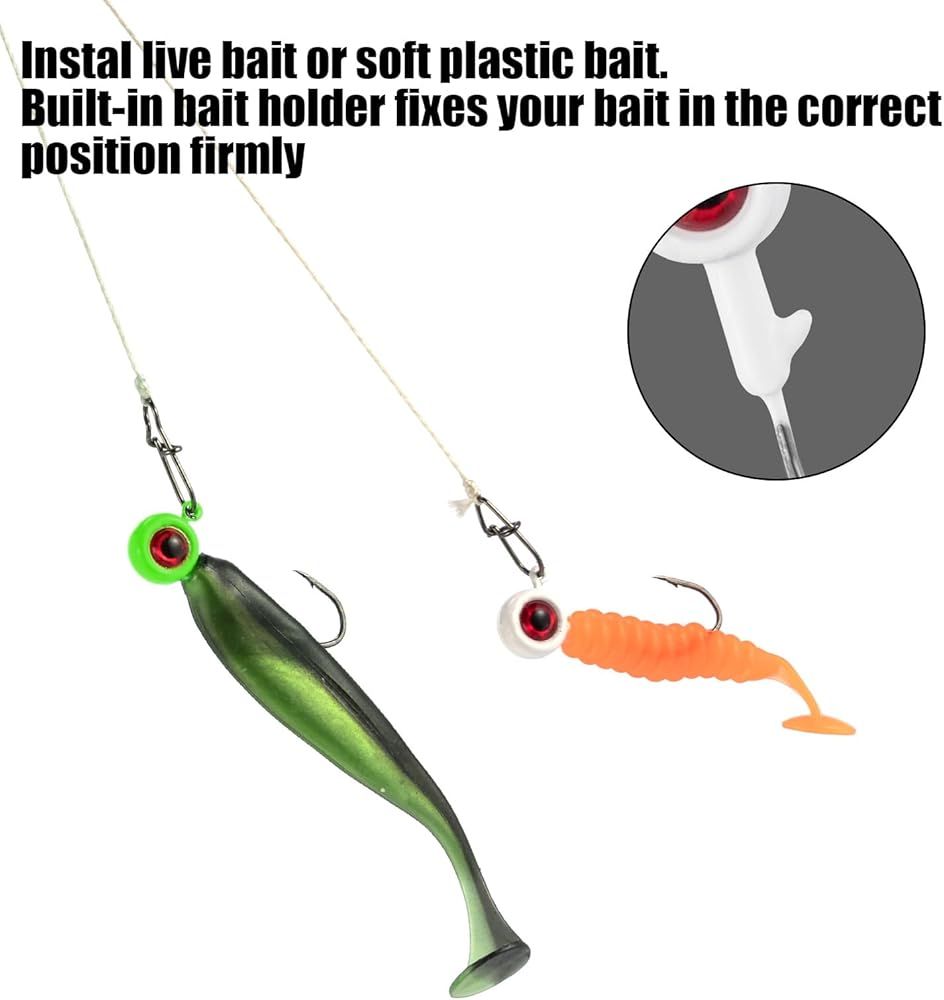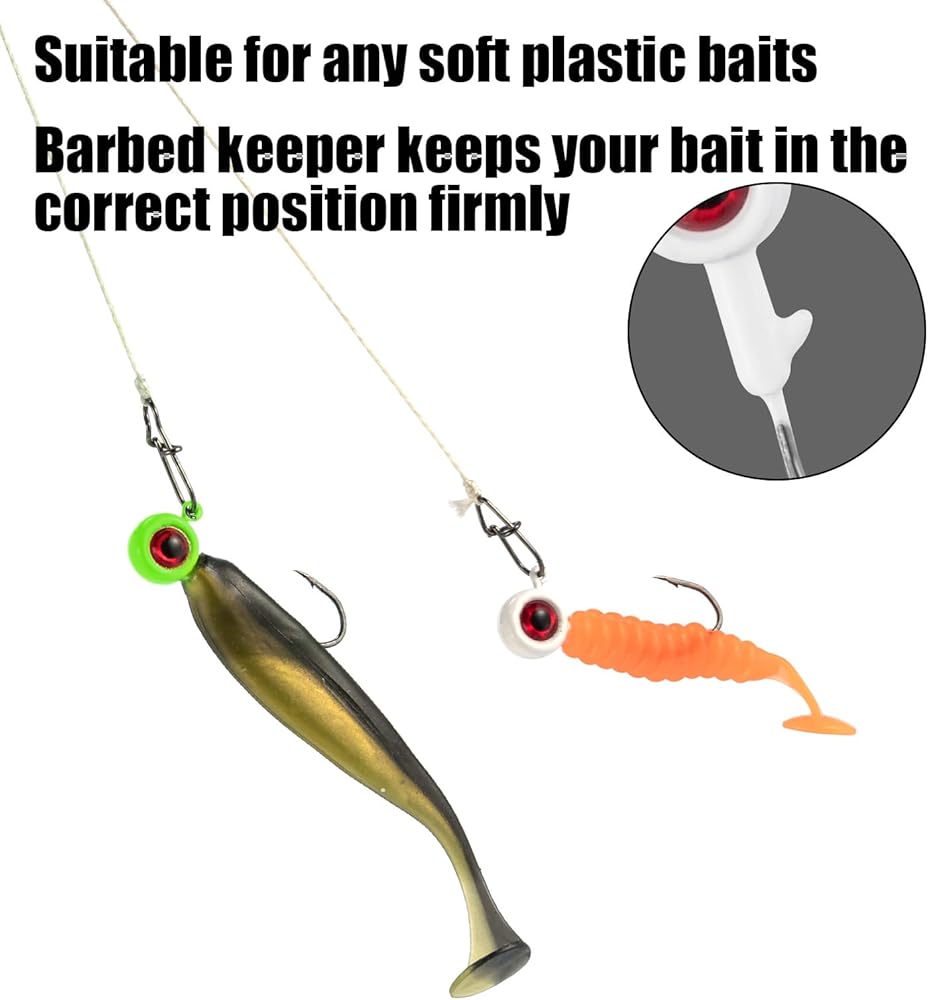 【Install Bait Firmly】: Sharp hook needle point makes it easy for you to install your live bait or soft plastic bait. Your soft plastic bait with 3D eye is enough to deceive the fish. Jig head has a built-in bait holder, which can keep your bait in the correct position firmly and is hard to fall off.