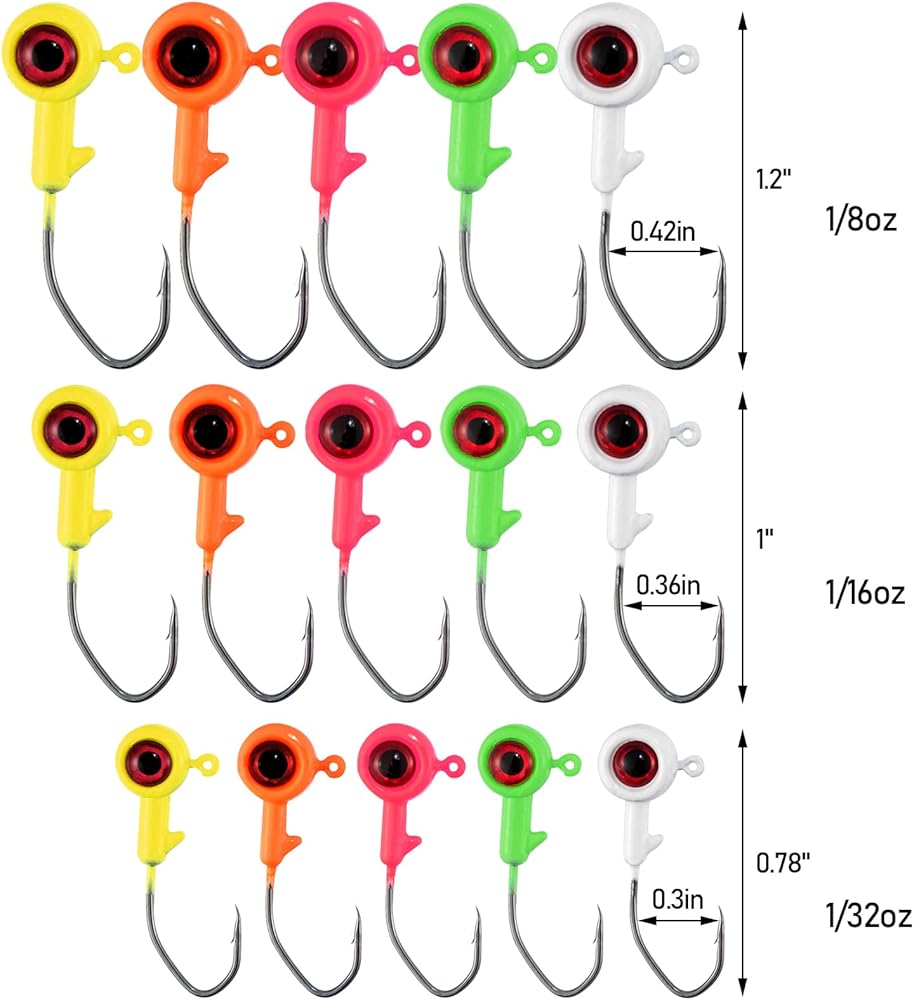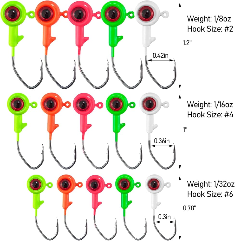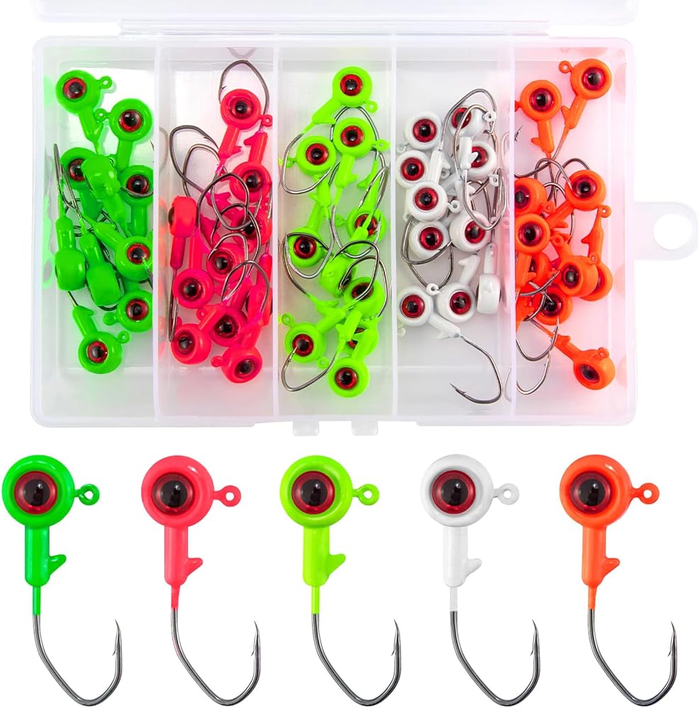【50pcs Crappie Jigs】: You will get 50pcs jig heads in a reusable storage box. 5 different colors(Chartreuse, Orang, Pink, White, Dark Green), 10pcs for each color. Three weight specifications: 1/32oz, 1/16oz, 18oz.