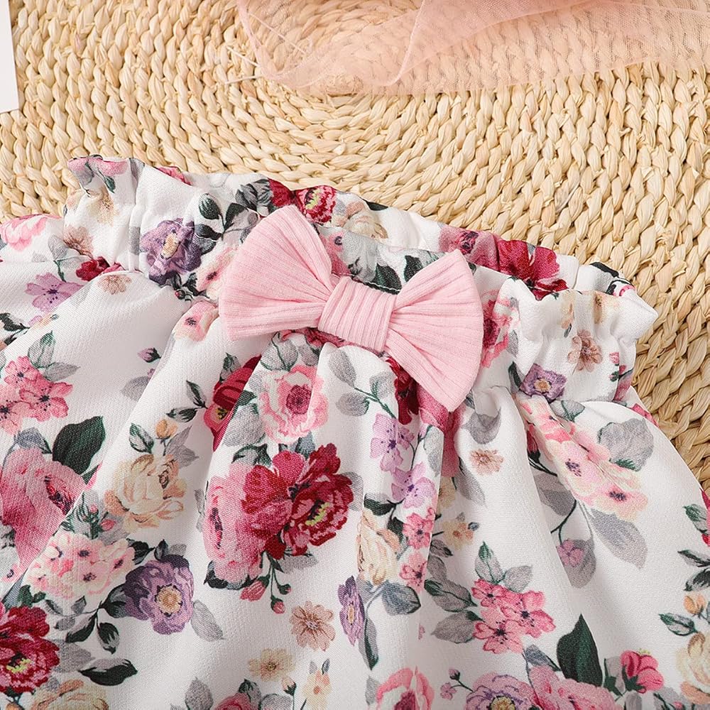 Features: dot, flower print,ruffle decor crop tops vest, floral Short skirt, shorts with elastic waist, cute bowknot headband, fashion and stylish, make your baby more attractive and adorable.