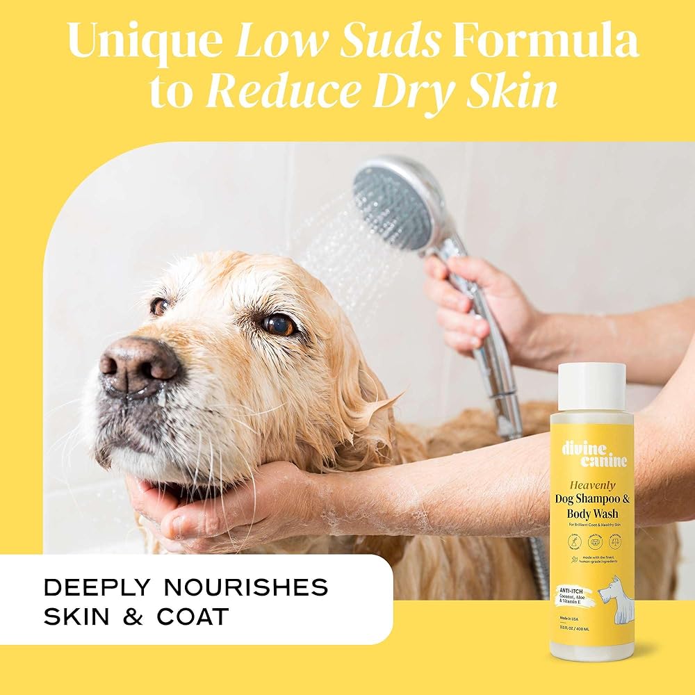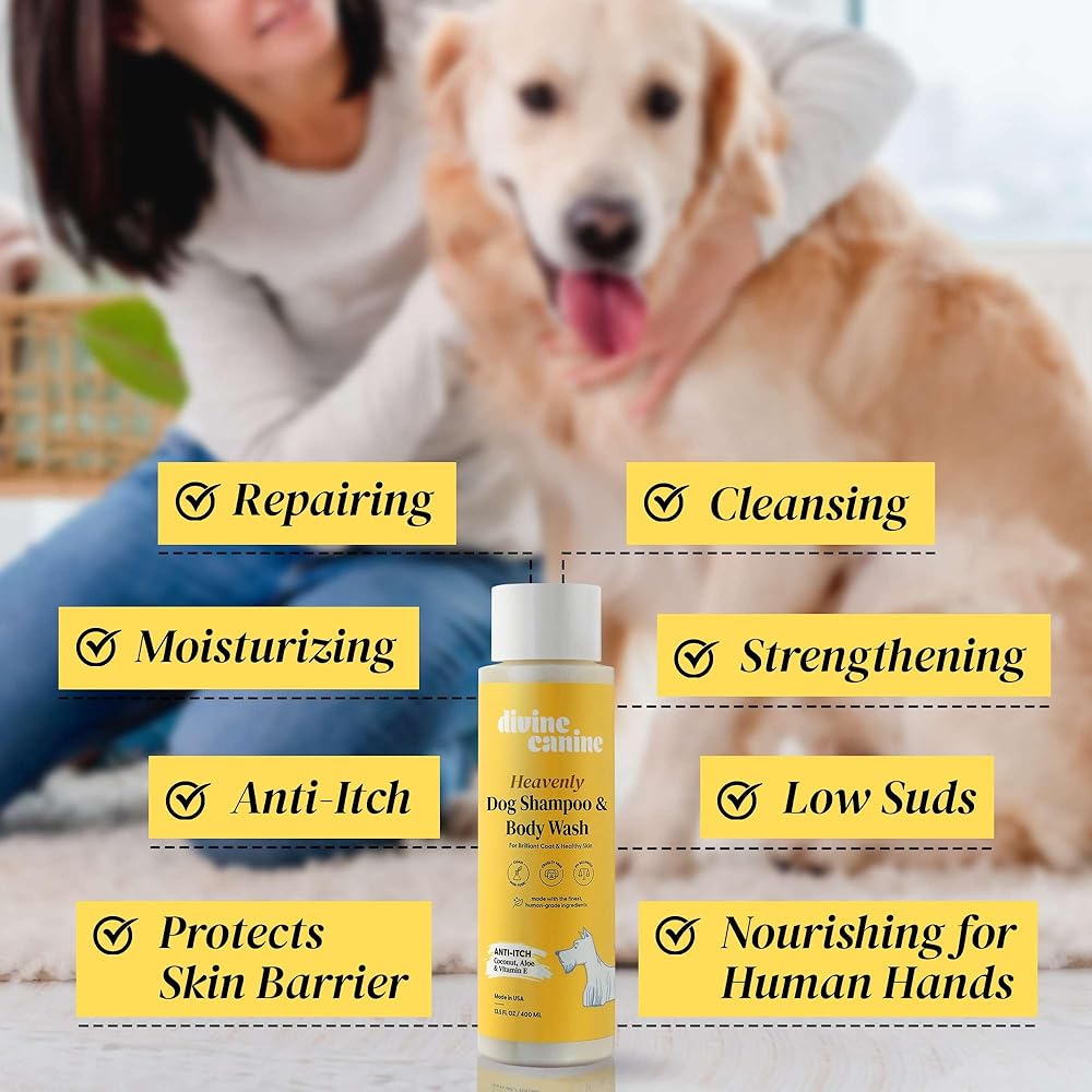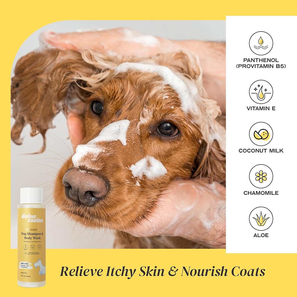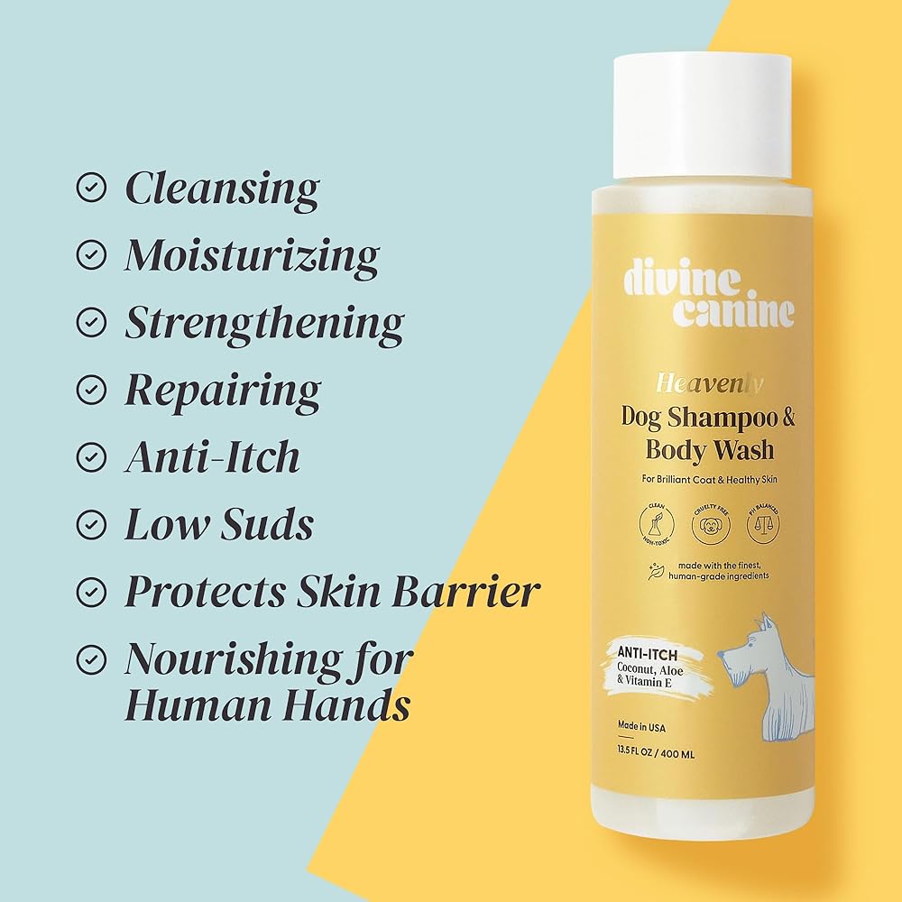 Heavenly Shampoo for Dogs: Crafted with human-grade ingredients, Divine Canine's formulas offer a spa-like treatment for your best friend. Pets and their people appreciate how the pure, wholesome ingredients deeply cleanse and soften for invigorating results. Collagen offers a natural reparative boost to skin and coat while other special elements focus on your dog's unique needs. A perfect balance of luxury, nourishment, and freshness, level up dog baths with our exceptional blends.