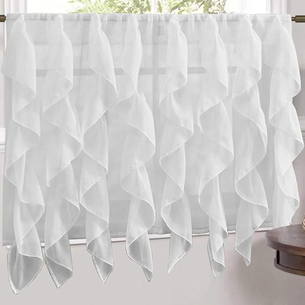Transform your kitchen into an elegant setting with these luxurious kitchen curtains. These heavyweight, polyester tiers and valances use lofted yarns to create the vertical cascading ruffled look. Each features a Series of vertical stitched ruffles that give the waterfall look. 5 piece set includes 2 tiers, and 1 valance. 3 piece set includes 2 tiers and 1 valance, tier pair and valance are also sold separately. 24 inch tier measures 24 inches H x 28 inches W each (combined width 56 inches), 36 inch tier measures 36 inches H x 28 inches W each (combined width 56 inches), valance measure 12 inches H x 56 inch W.