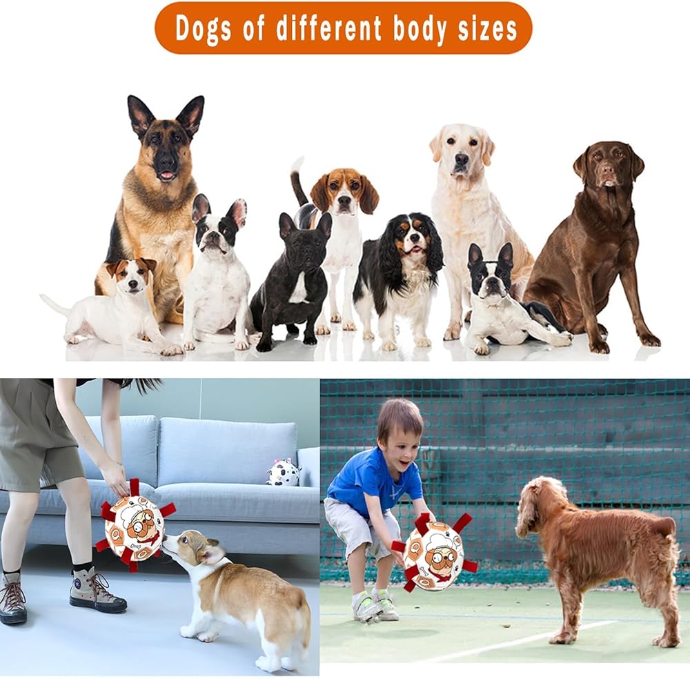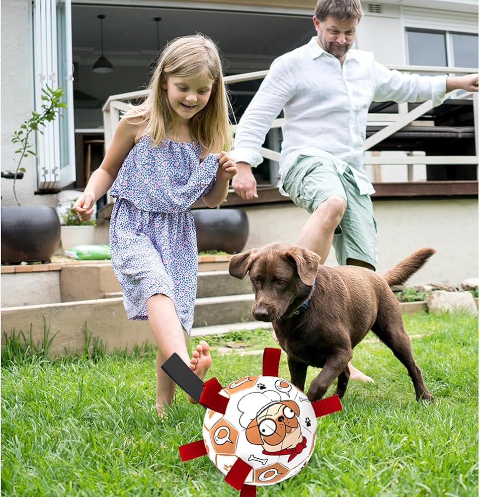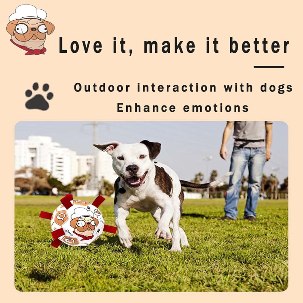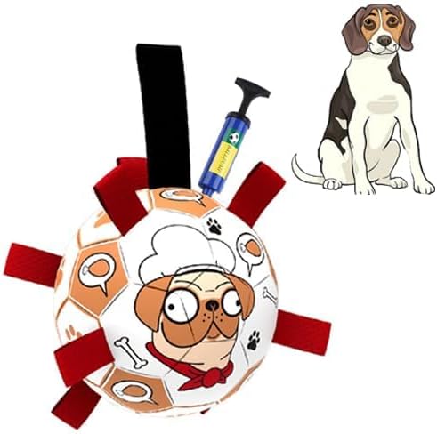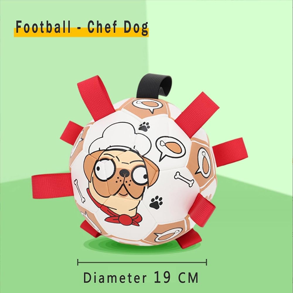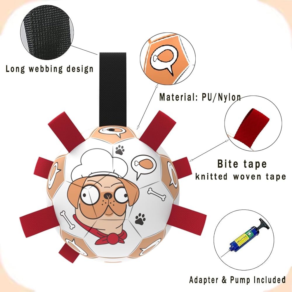 Safe and durable: The dog ball is made of high quality PU material and can be kicked and bounced up just like a standard soccer ball. The ball s straps are very soft and the soccer ball is lined with cotton yarn rubber lining for upgraded protection and safety. It is also very easy to clean. The soccer dog toy is 8 inches in diameter and is perfect for small, medium and large breeds, but not for offensive aggressive dogs.