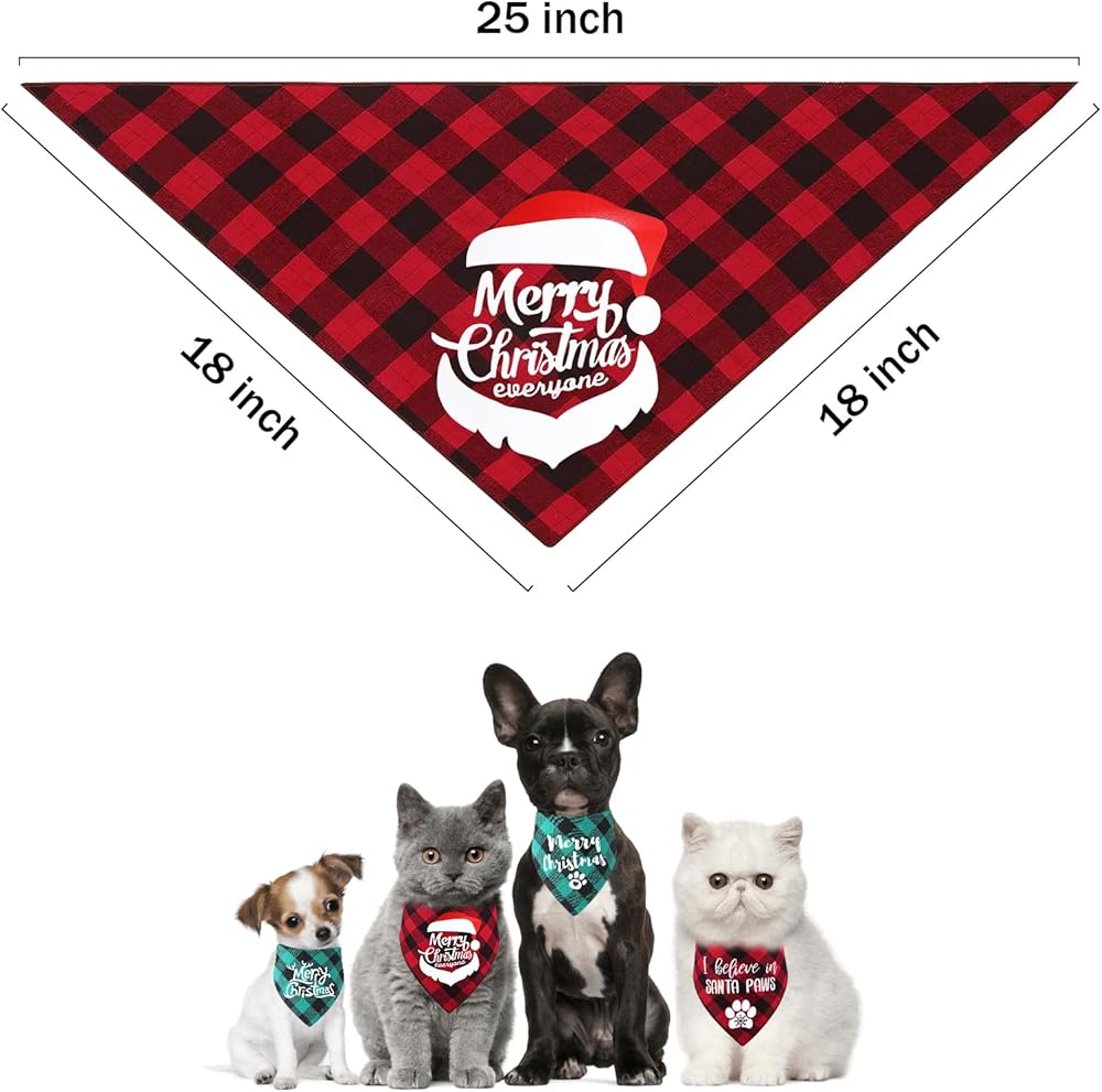 باندانا للكلاب في العطلات: 4 × منديل منقوش للكلاب في عيد الميلاد، تستخدم منديل كلب العطلات تصميمًا كلاسيكيًا منقوشًا، وهو عصري وخالد. "Merry Christmas" و"I Believe in SANTA PAWS" مطبوعان على الجهة الأمامية، وهو مناسب لتزيين أزياء الكلاب في العطلات. لا توجد طباعة على الظهر، وهو مناسب للاستخدام اليومي.