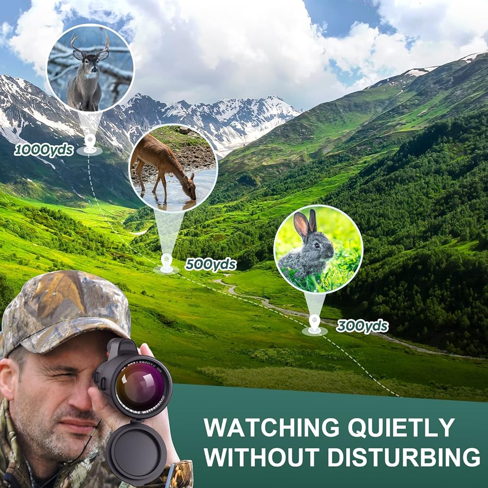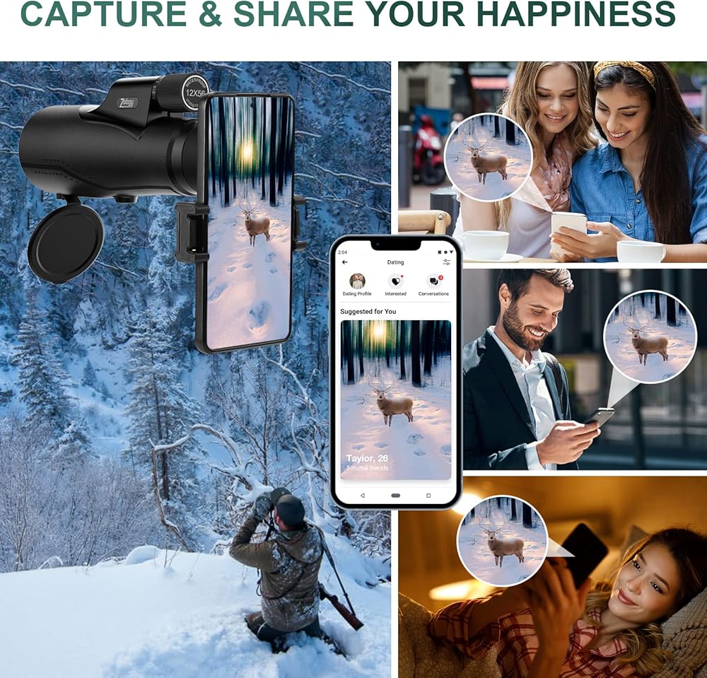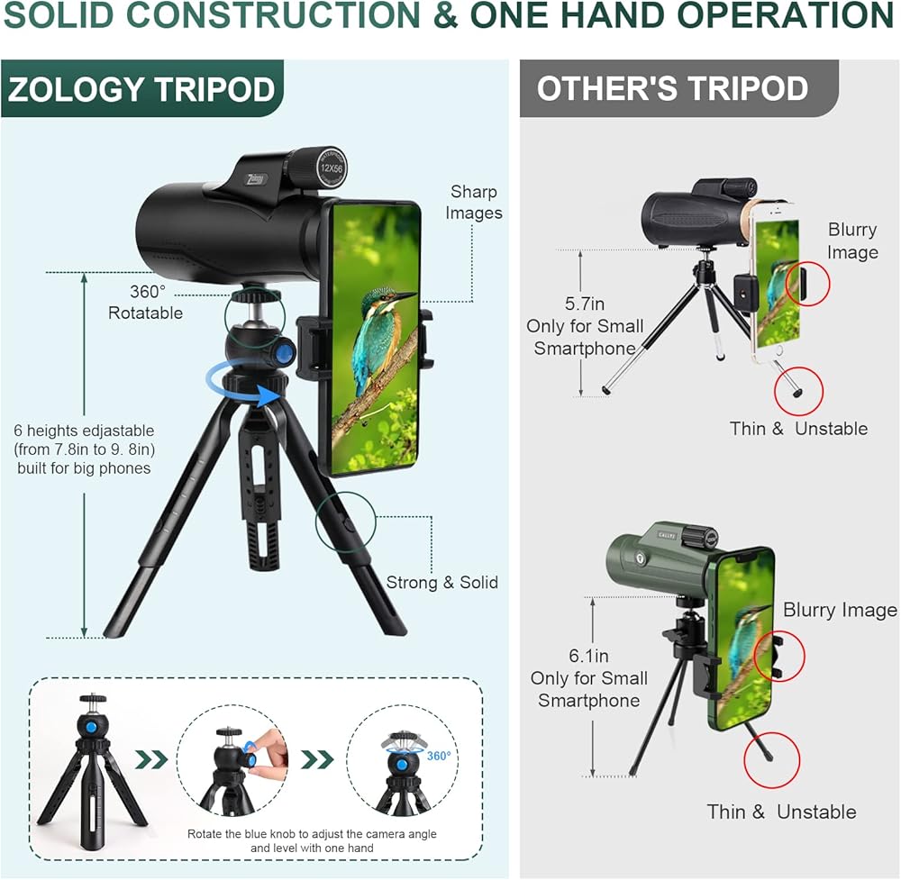 Capture & Share Your Happiness:Whenever you are hunting,hiking or birdwatching,it's always a great idea to share the happiness with your family or your friends.This monouclar telescope comes with phone adapter and tripod,they will help you take some good photos and videos easily