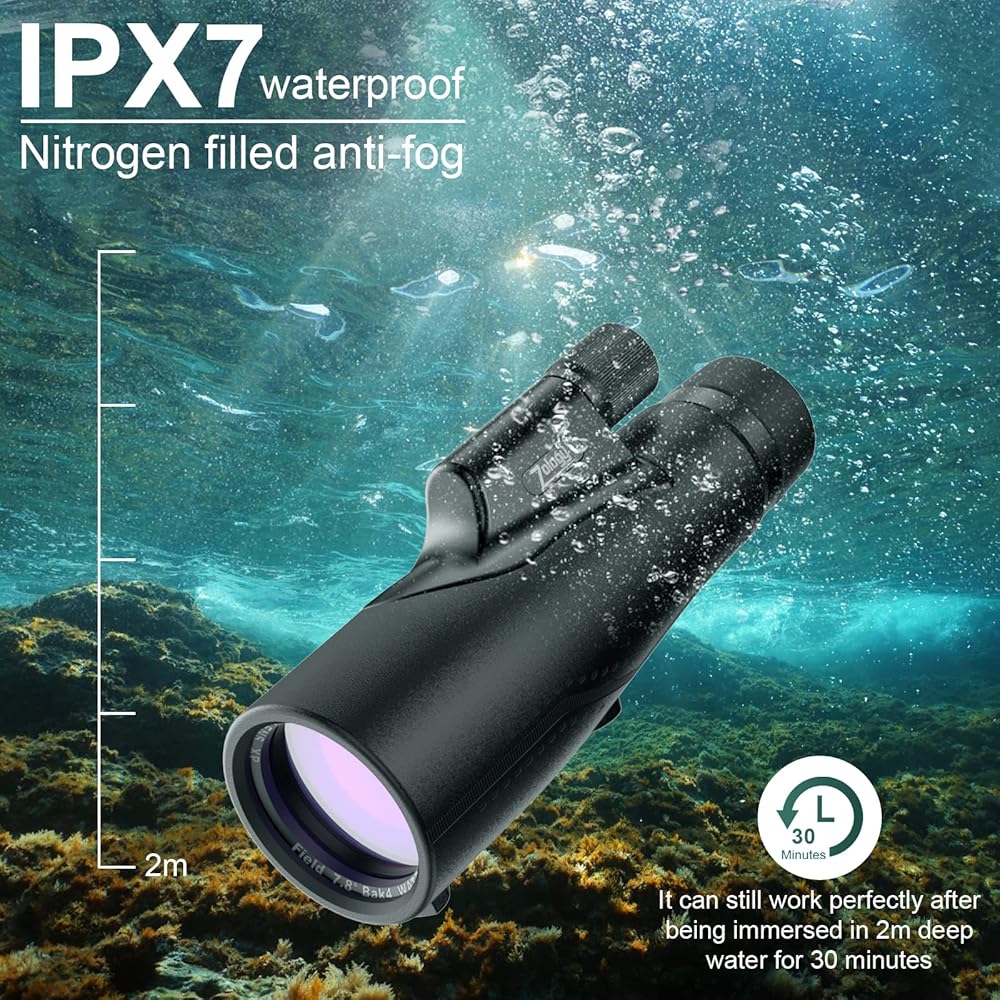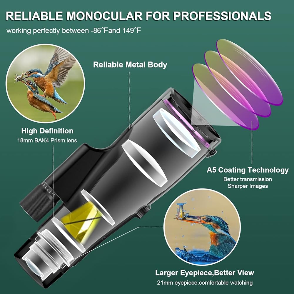 Weather Proof,IPX7 Waterproof,No Foggy,No Fuzzy,Reliable Monocular for both Zmateurs and Professionals:Metal body filled with nitrogen,optics lens fully coated under A5 next generationtechnology,delivery 99.99% transparency performance.This hunting monocular telescope working perfectly between -86℉and 149℉