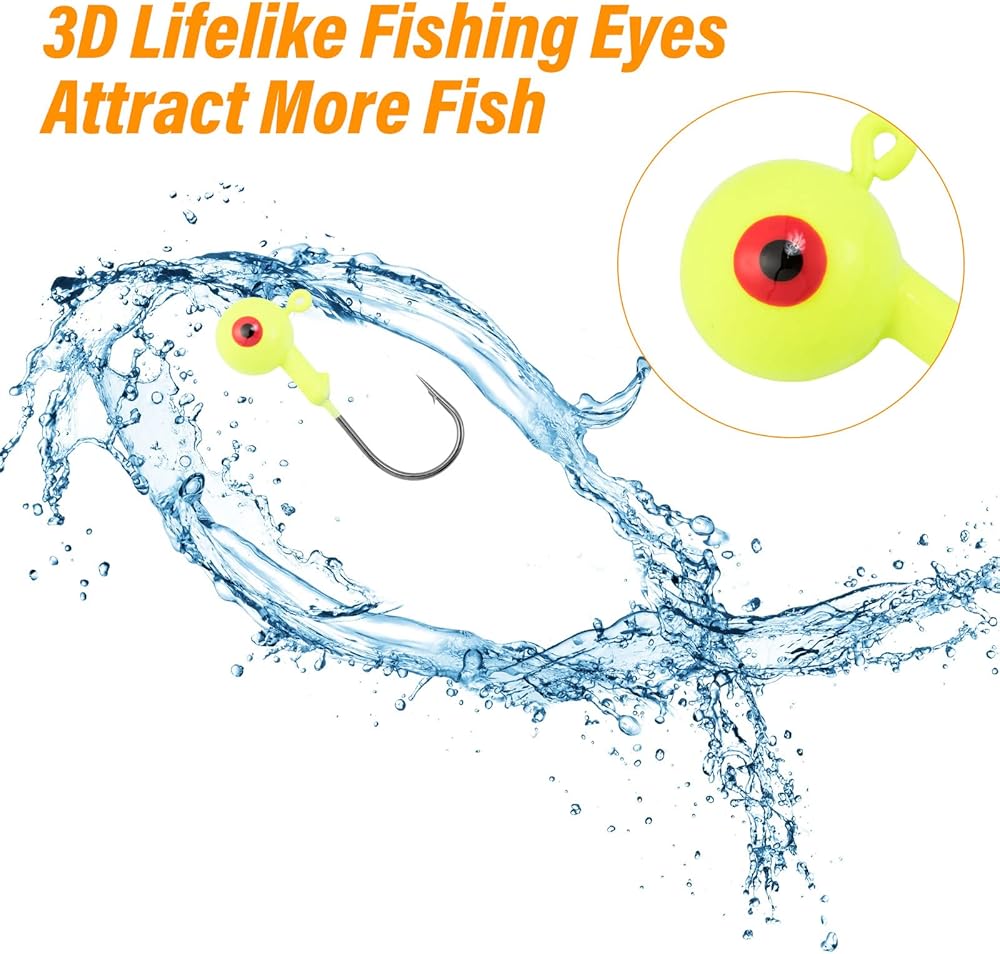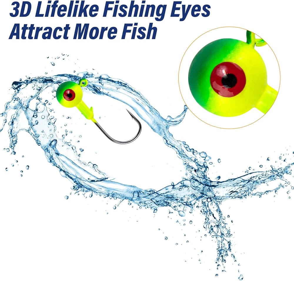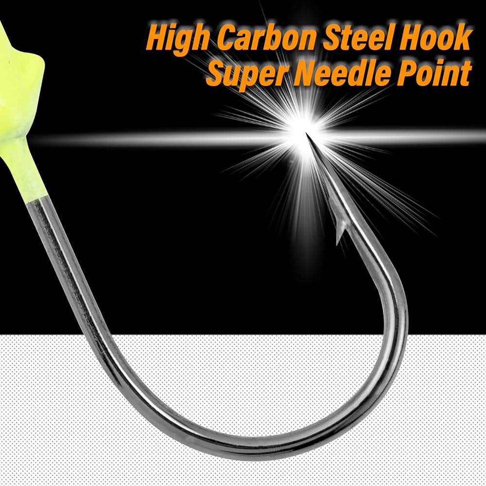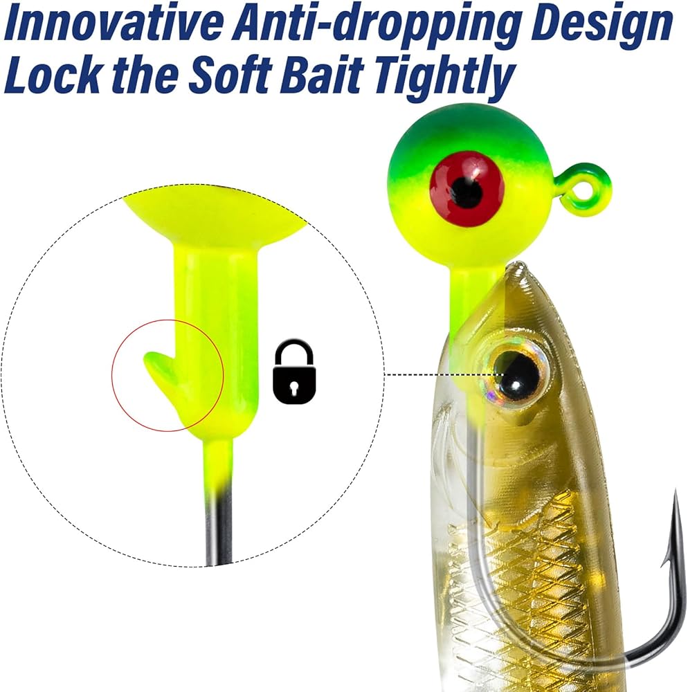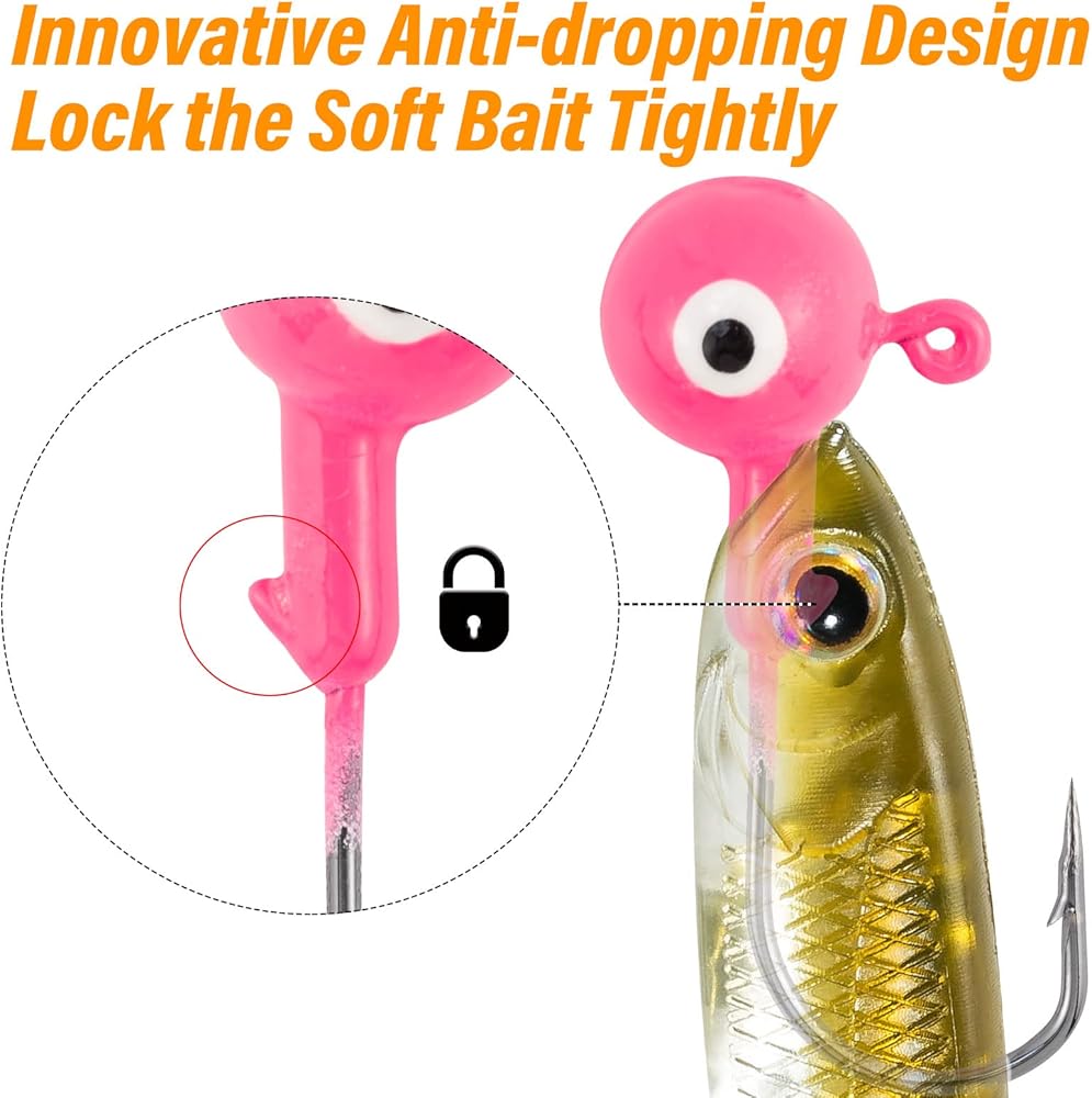 【Colorful Jig Head】 Unique design double 3D fishing eyes and colorful jig head can attract more fish. Green, Luminous, Pink, Orange, Yellow, up to 5 colors can be purchased.