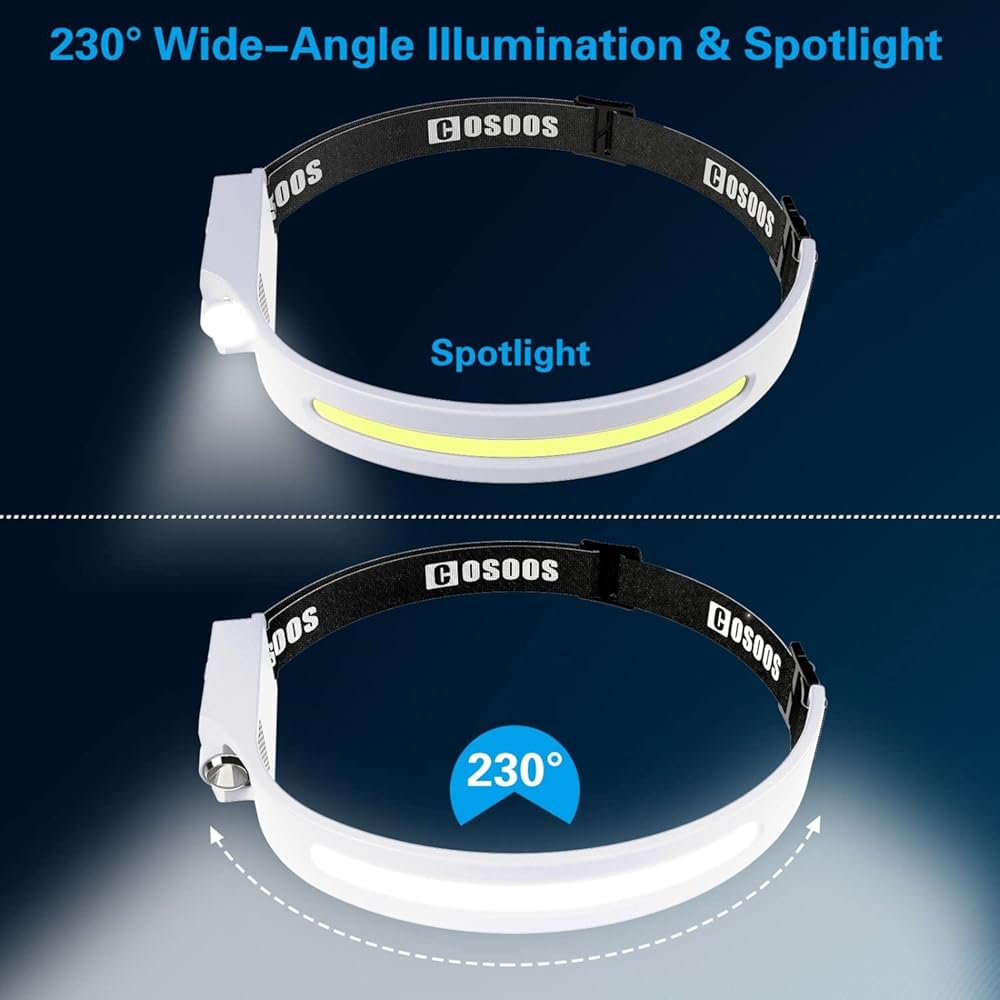 ✔️Birthday Gift for Adults & Kid, Hiking & Camping Essentials, Spot Light & 230° Wide Beam Headlamp Rechargeable – COSOOS the original silicone rubber headband headlamp flashlight lights up your surroundings and eliminates the need to move your head to illuminate viewing area. You can also use its spotlight to focus on some spot and see farther. Great gear/backup for mechanic, home, basement, garden, car, camping tent or when electricity not supplied due to hurricane, snowfall.