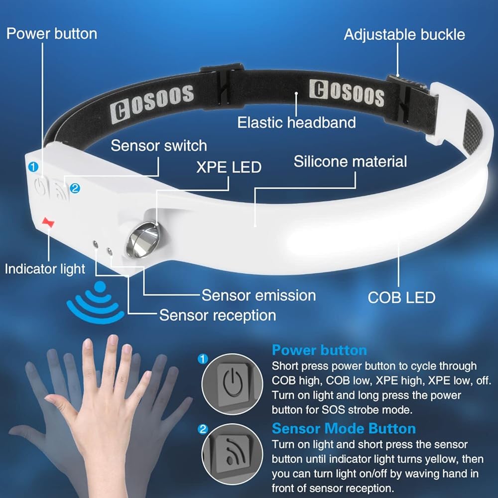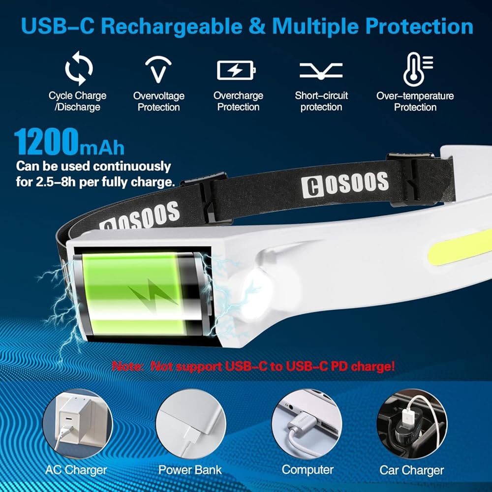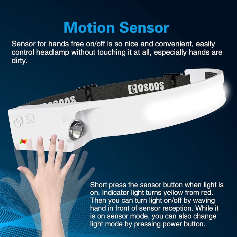 ✔️Motion Detection Technology, Hand-Free Light – Save tons of extra battery. Our COSOOS wide angle headlamp has built-in 1200mAh lithium battery and please charge it by included usb c charging cable before use. Choose 1 of brightness settings, short press sensor button and set it as motion detection (Indicator light turns yellow from red.) Then you can turn light on/off by waving hand in front of sensor reception.