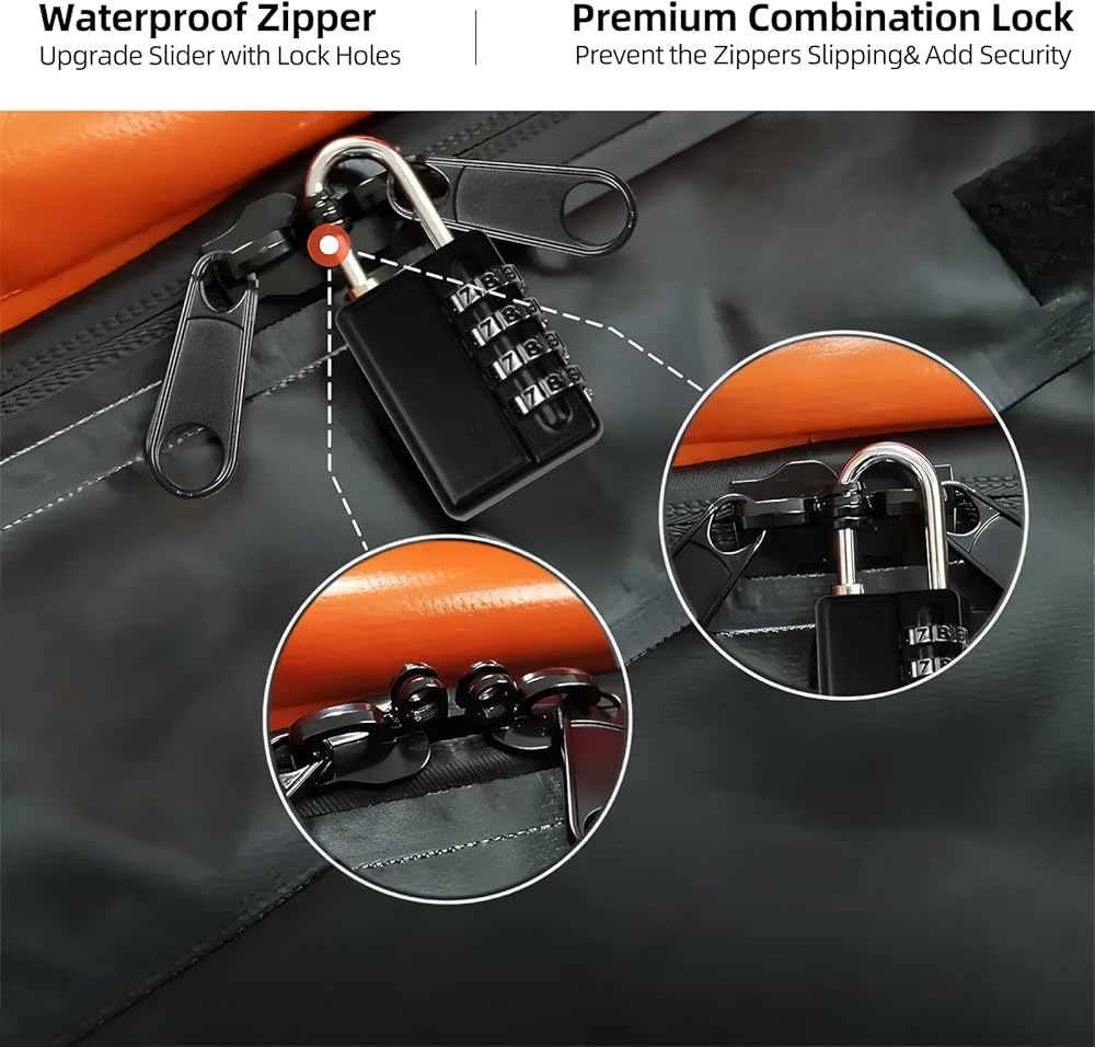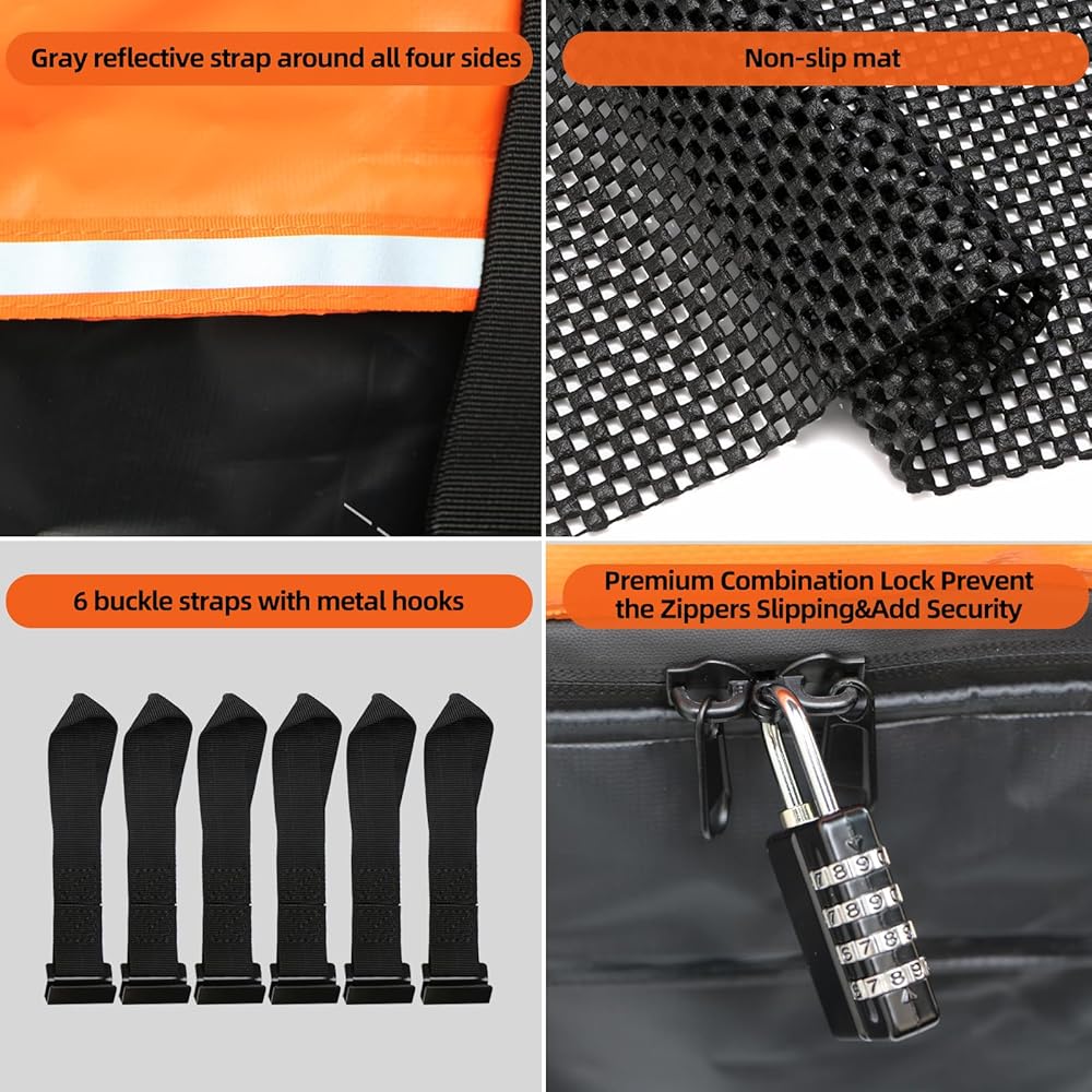 Enhanced Safety: The gray reflective strap around four sides escort for your night journey. The non-slip mat to help secure luggage bags and secure them with the provided combination lock. Features eye-catching orange & black colors to improve visibility.