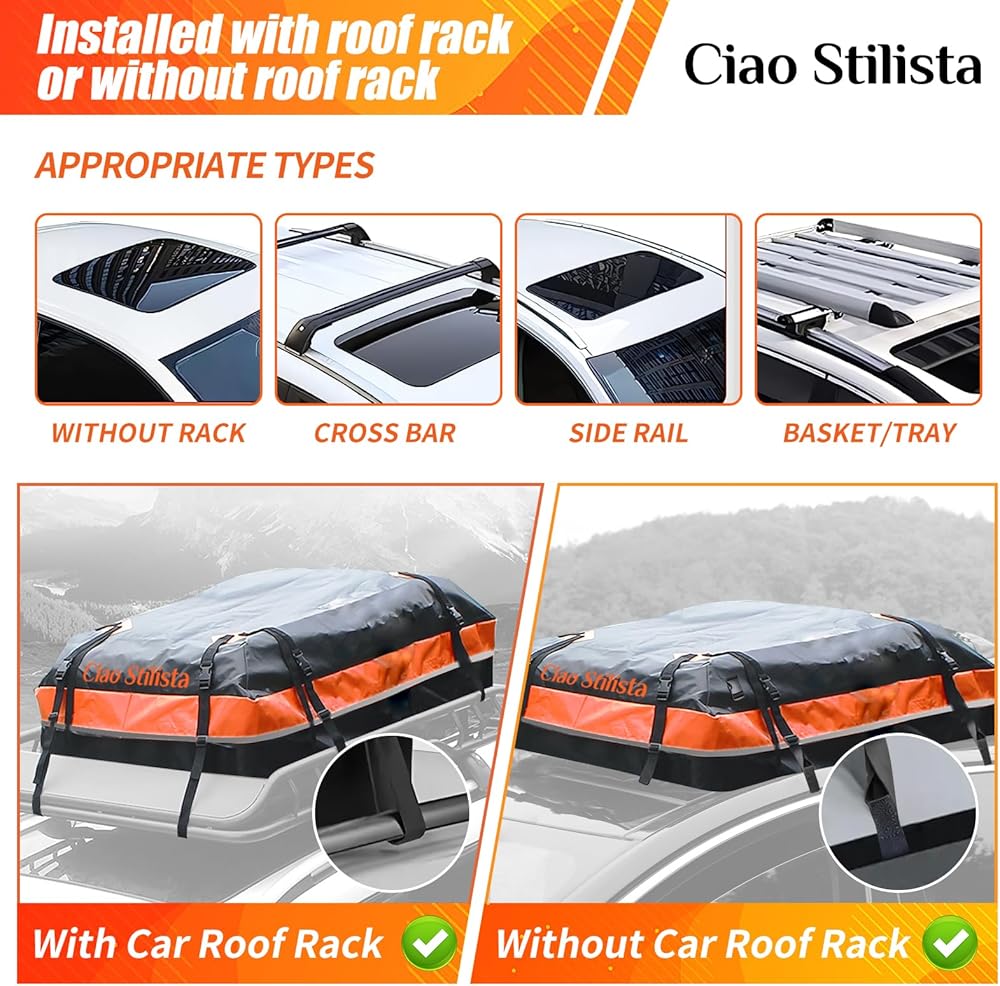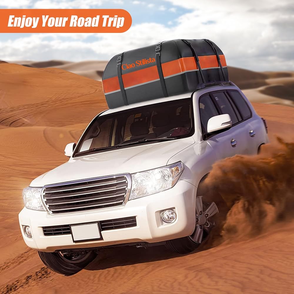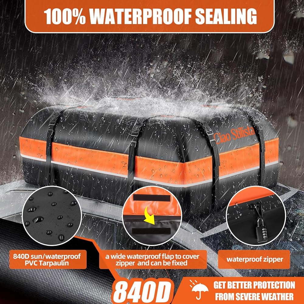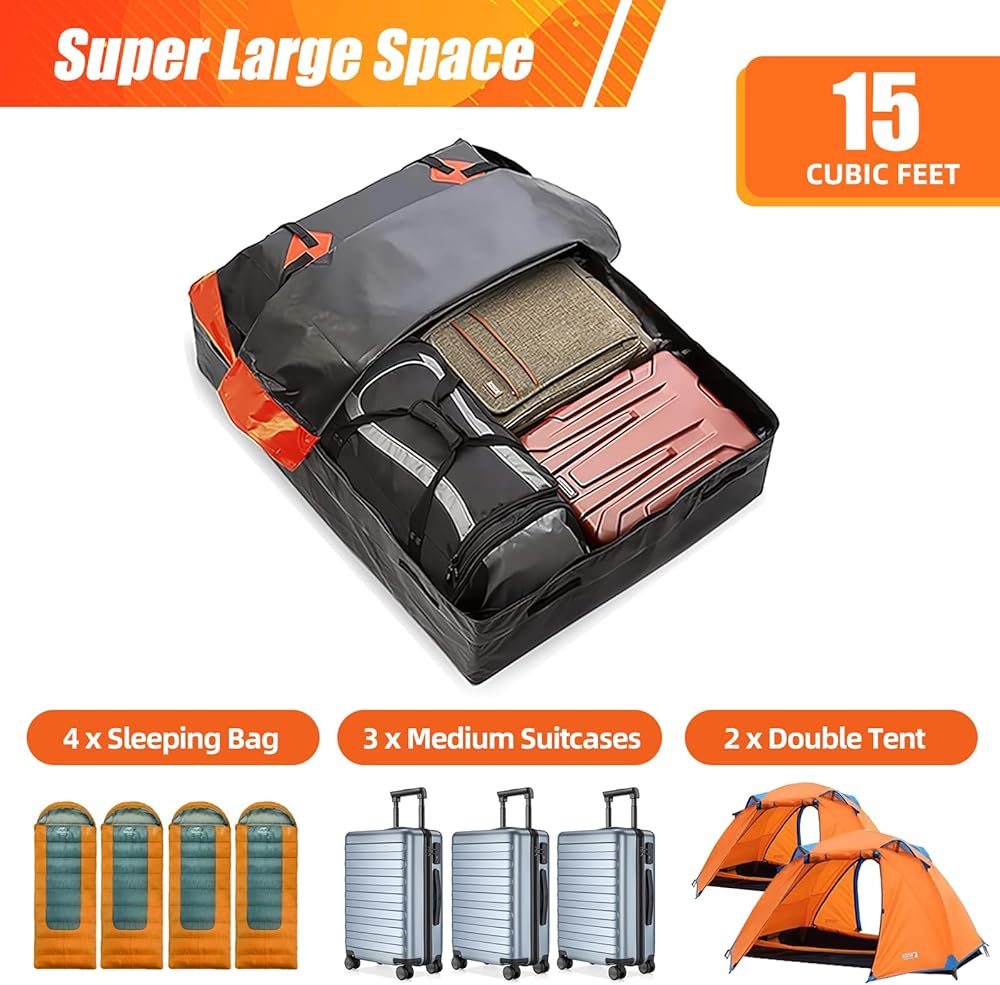 Rooftop cargo carrier bag with 15 cubic feet for vehicle roof with/without side rails.