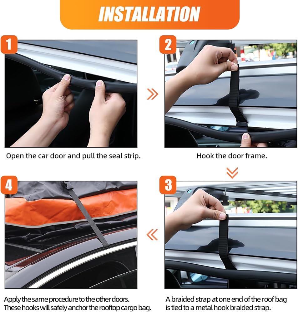 For all vehicle with/without roof rack: Attach it to the roof racks with tightly stitched buckle straps. Or put it on non-slip mat offered and fix it with the metal hooks offered to attach car door for vehicles without roof racks.