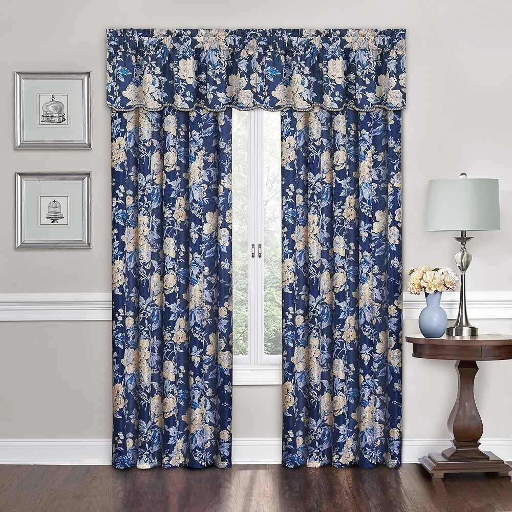 Refresh any room in your home with classically elegant window treatments by Traditions by Waverly. This beautiful, traditional panel features a lovely floral print over a damask jacquard fabric. Each curtain panel measures 52wide x 84Long. Hang two panels with the coordinating valance on a standard or decorative curtain rod for desired look. Coordinating valance sold separately. 2 inch header adds decorative style. 3 inch rod pocket accommodates up to a 2.5 inch rod. Curtain rod sold separately. 100percent polyester, unlined. Machine wash cold, gentle cycle. Tumble dry low. Imported.