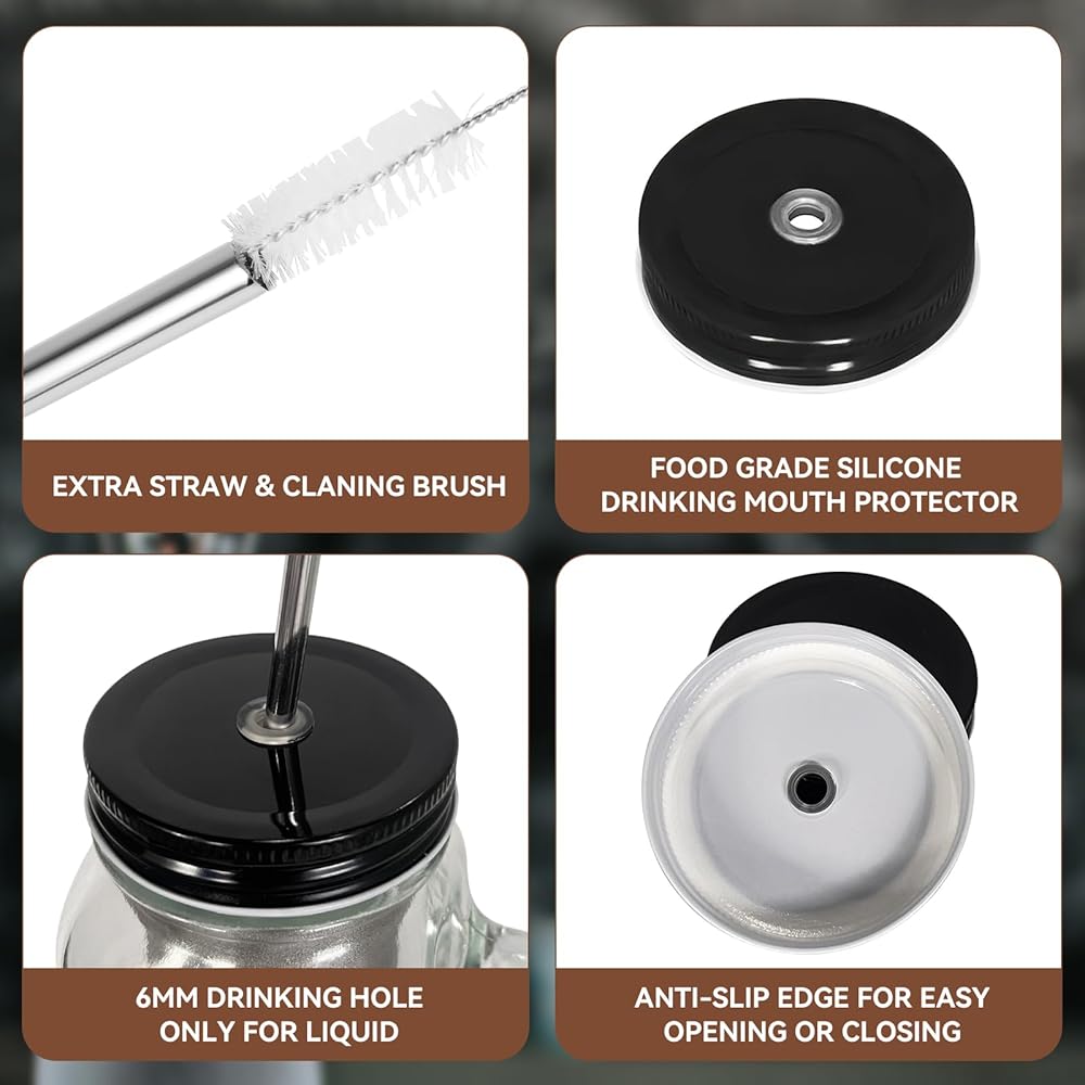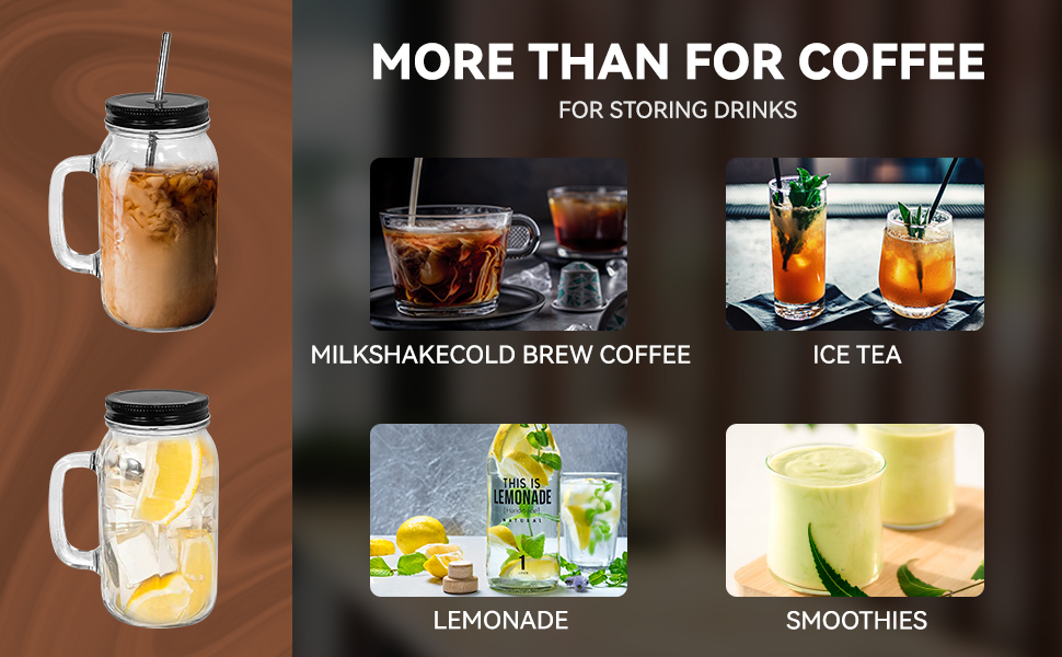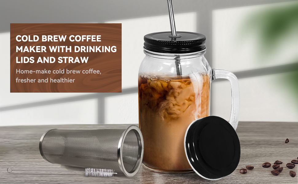 Product descriptions: LonXFan Cold Brew Coffee Maker, Iced Cold Brew Coffee Maker With Metal Drinking Lid - Heavy Duty Glass Jar Coffee Brewer with Premium Mesh Filter & 750ML/25OZ Specifications: Volume:750ML/25OZ Jar Color:Clear Lid Color:Black Jar Materials:Heavy Duty Glass Lid Material:Metal Package Included: 1 pack x cold brew coffee maker jar 1 pack x premium mesh filter 1 pack x metal drinking lid 1 pack x metal storage lid 1 pack x stainless steel straw 1 pack x lid cleaning brush