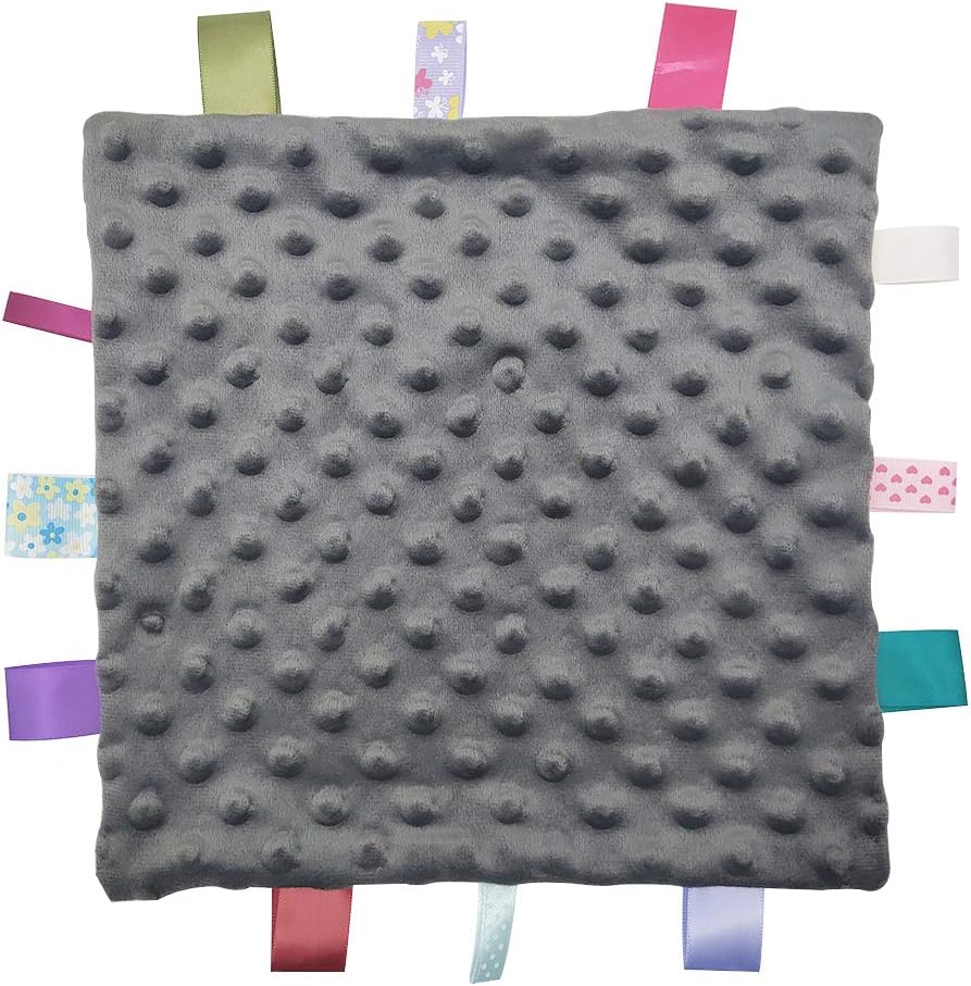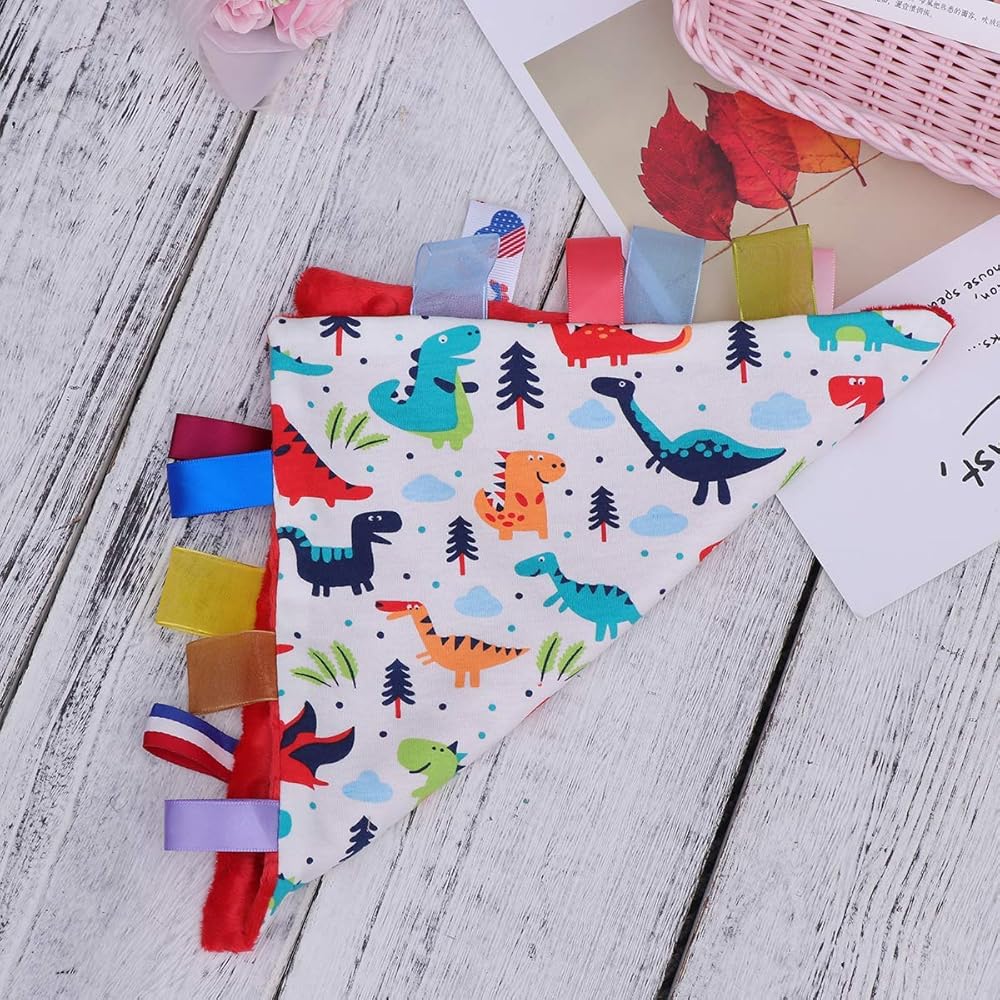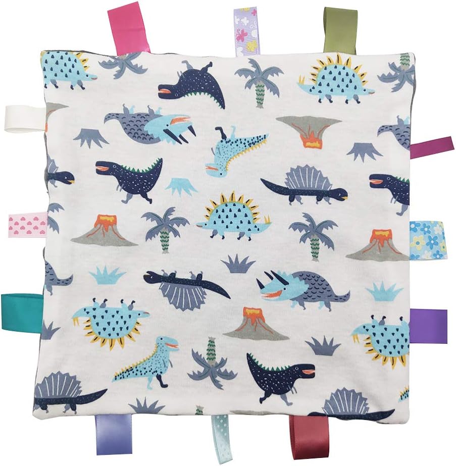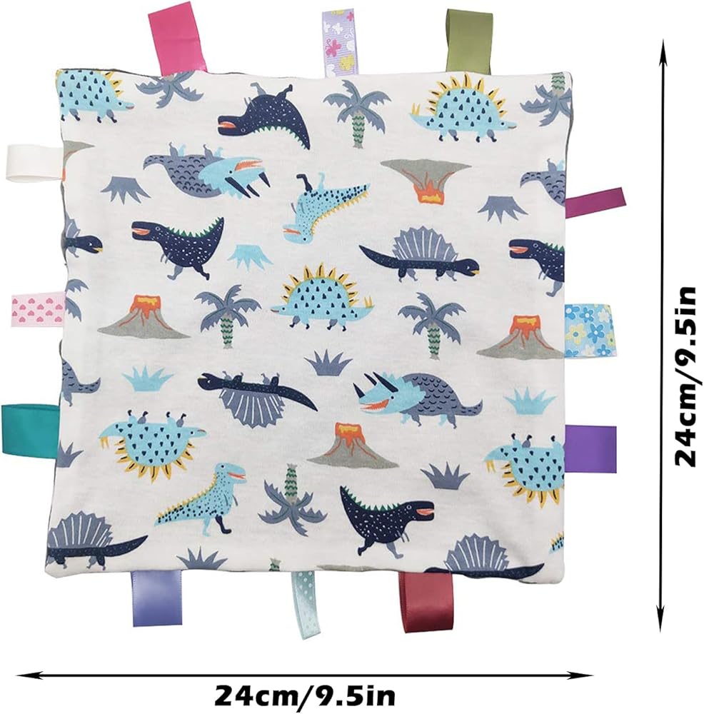 It's small enough to sleep with and not worry about it covering my 18 month old grandson's face (9.5” x9.5”) and has plenty of touchy/feely ribbon tags around all edges.One surface is soft, cotton tee-shirt material with dinosaurs, and the back is super-soft textured plush. Just perfect for my little tactile guy!