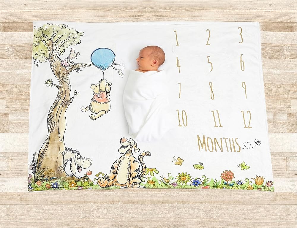GREAT GIFT FOR BABIES, FAMILY & FRIENDS: Pooh first twelve months blanket is an easy and creative way to record baby's milestones for your photo album scrapbook and easily share monthly growth photos with everyone! This also makes a wonderful keepsake and baby shower gift for mommy-to-be!