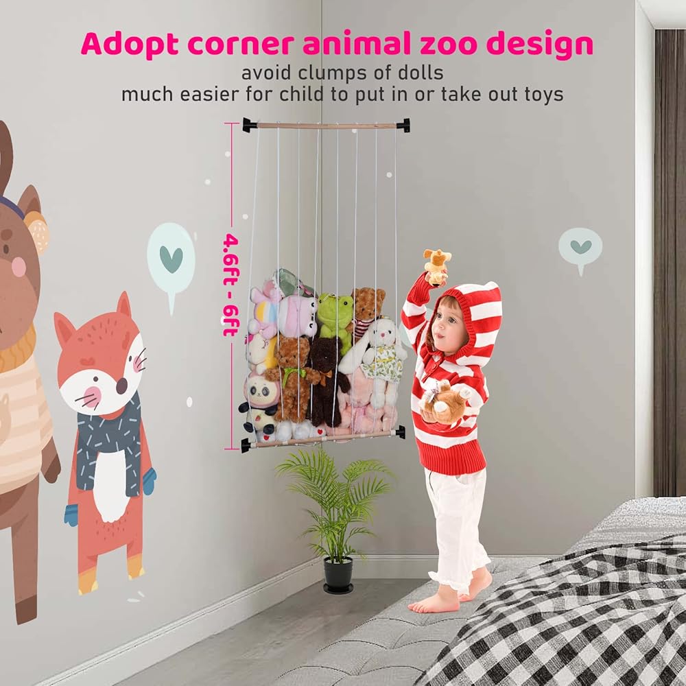 Practical Design: This stuffed animal holder comes with vertical design, which is very convenient for children to pick up the toys they want. 8 elastic ropes designed to prevent toys from falling like a stuffed animal zoo. Essential plush toy storage tool.