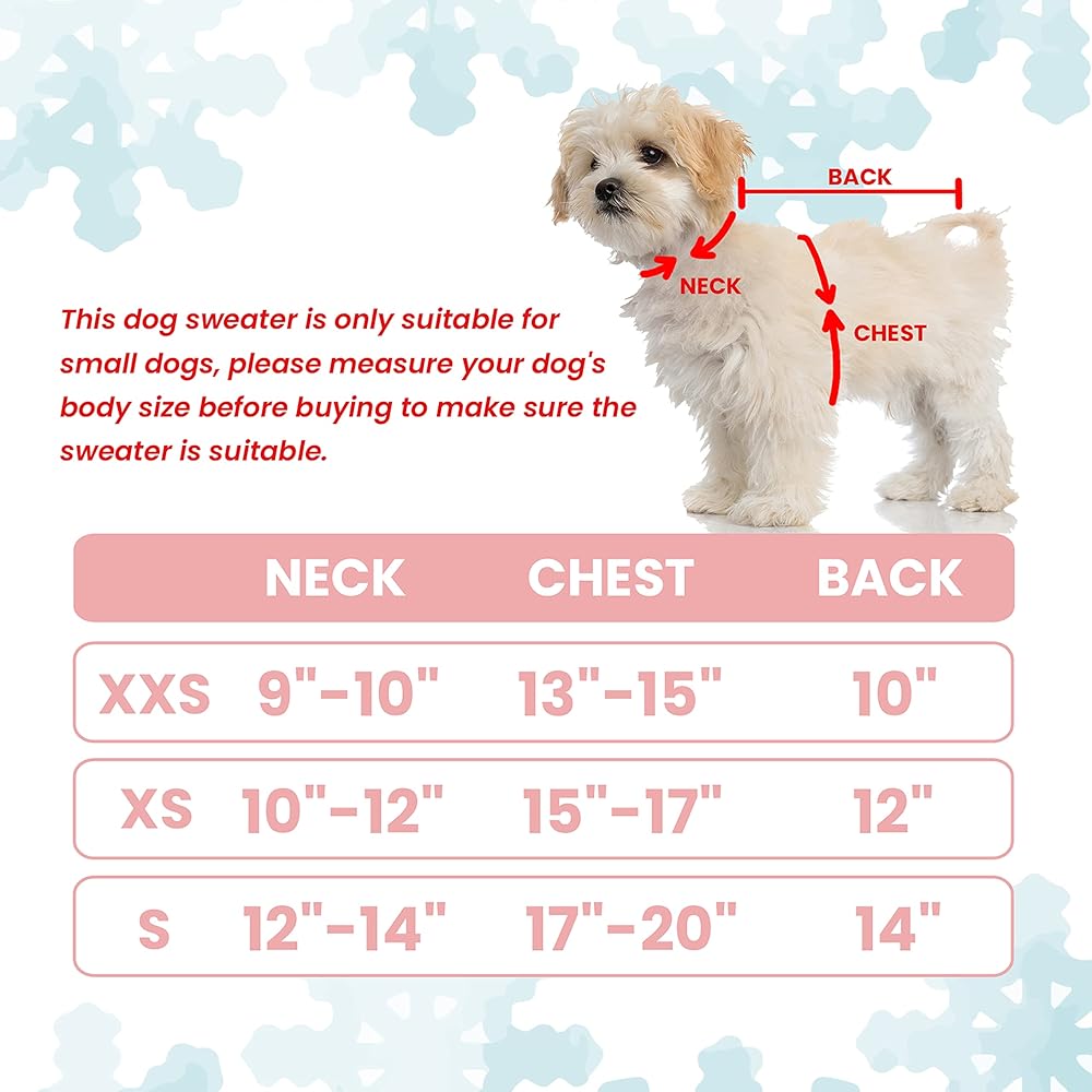 SIZE CHOICE: This dog sweater is only suitable for small dogs, please measure your dog's body size before buying to make sure the sweater is suitable.10#:neck 9"-10", chest 13"-15", back length 10"; 12#:neck 10"-12", chest 15"-17", back length 12"; 14#:neck 12"-14", chest 17"-20", back length 14".