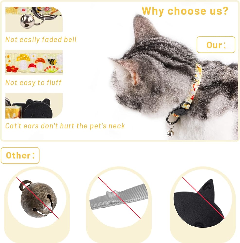 Safety Breakaway Feature: Most cats are explorers and like to jump up and down, so each cat collar is designed with a breakaway buckle.When the cat is accidentally hooked, the collar will automatically separate when the cat breaks free, thus protecting the life of the cat.but it will not come off from just scratching at it.