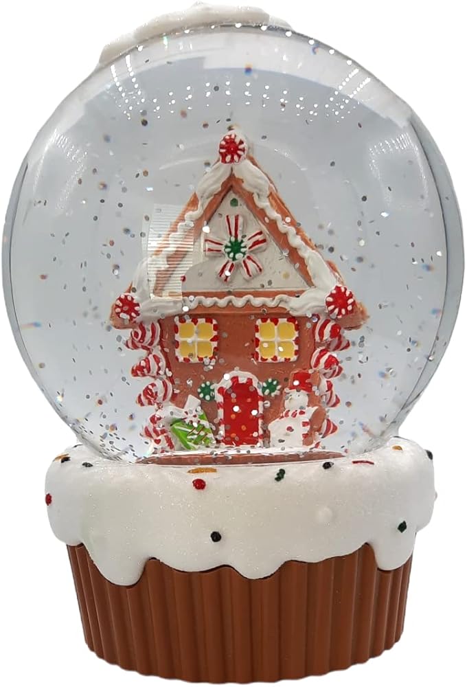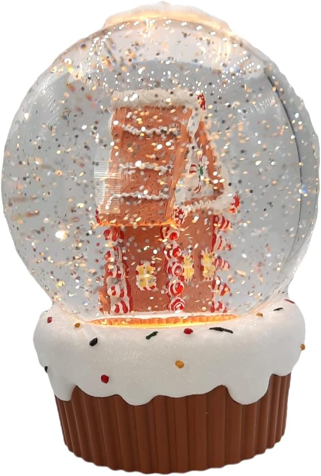 Lighted Christmas snow globe lantern featuring a gingerbread house with snowman
