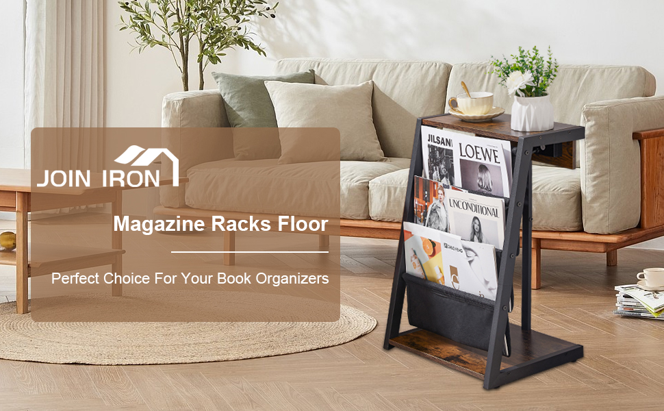 JOIN IRON Storage Bookshelf Detachable Brochure Display Stand Newspaper Stand with USB Ports and Outlet Floor-Standing Magazine Rack with 4 Pockets Easy to Move Easy to Assemble for Living Room