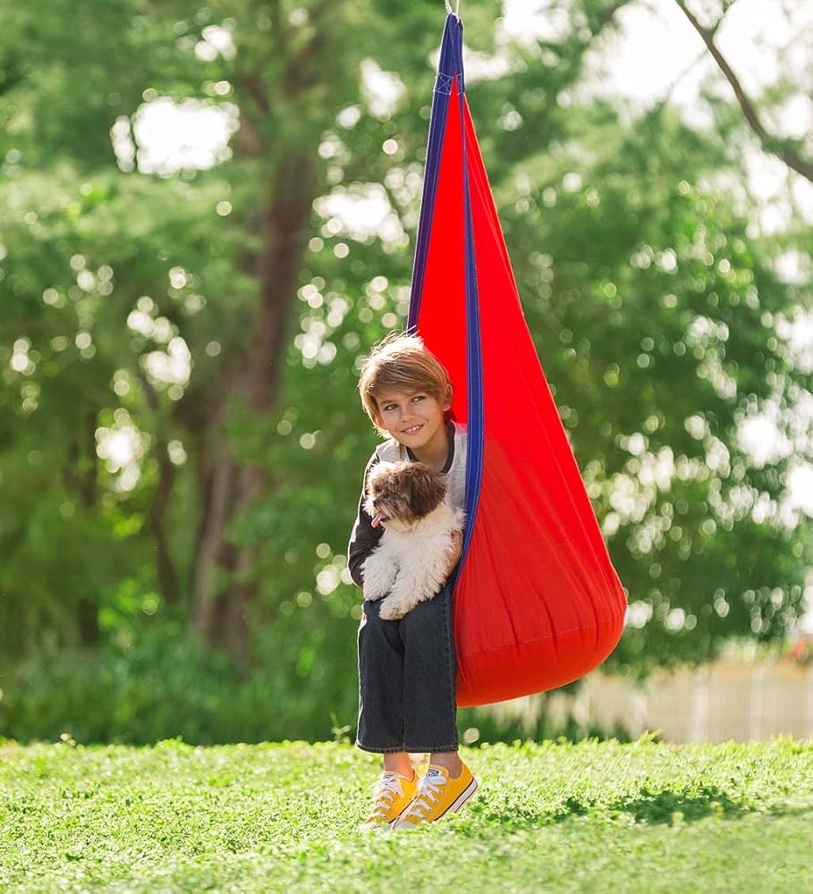 EXCLUSIVE HANGING CHAIR: Our HugglePod Original portable play space and sensory hanging chair is the perfect place for kids ages four and up to hide away with a great book, play with their favorite toys, or take a nap. Measures 55"H x 28" diam. and holds up to 175 lbs.