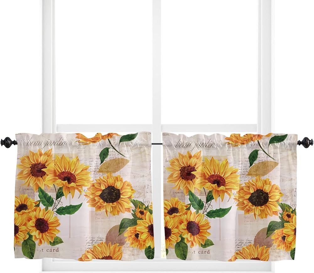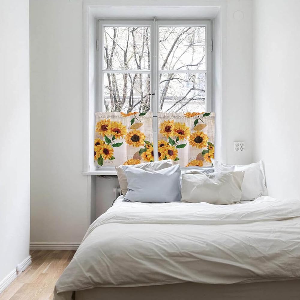 Sunflower Window Tier Curtain 24 Inches Long Set of 2 Panels, Farmhouse Half Windows Rod Pocket Kitchen Curtains Floral Rustic Newspaper Small Kitchen Drapes for Bathroom Cafe 55''x24''