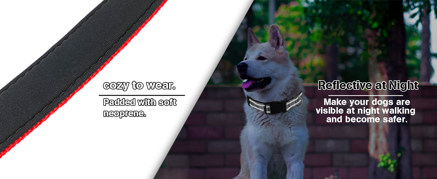 🐕 Reflective at Night - there is double lines of reflective stitching on the whole thick dog collar, it will be reflective when light shoots on it, which make your dogs are visible at night walking and become safer.