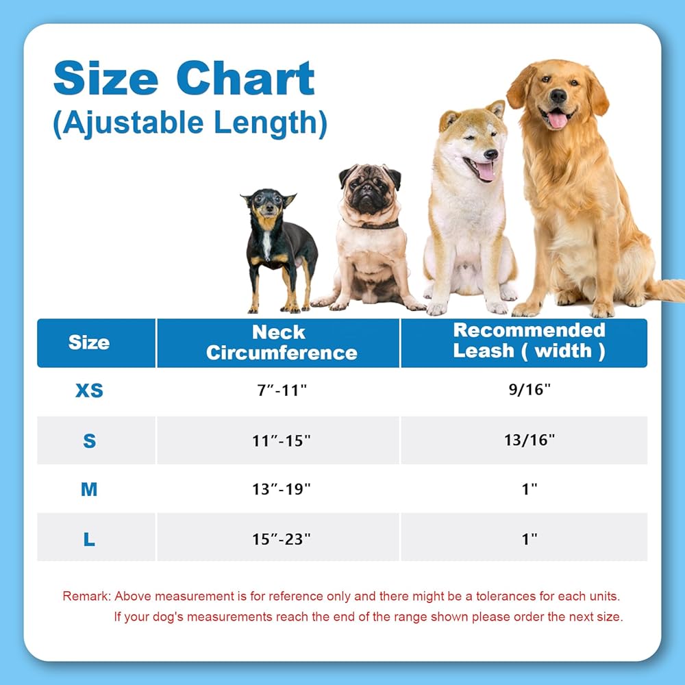 🐕 Multi size for option - X-Small Width 9/16", Neck Size 7"-11"; Small Width 13/16", Neck Size 11"-15" ; Medium Width 1", Neck Size 13"-19" ; Large Width 1", Neck Size 15"-23", Suitable for Extra Small Dogs, Small Dogs Medium Dogs and Large Dogs.