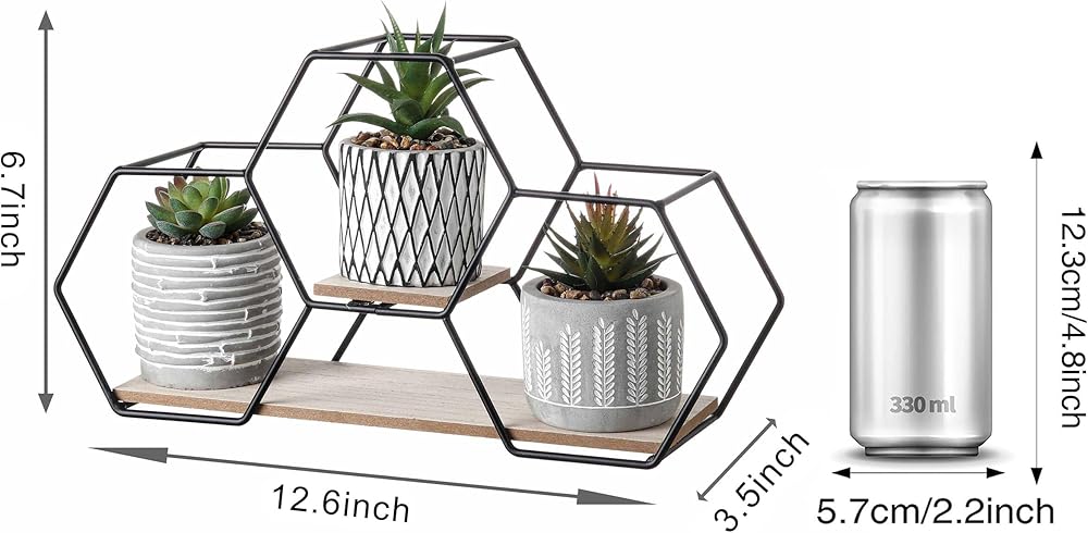 【Original Design】These cute artificial potted plants come in a pack of 3 with a metal and wood shelf that can be assembled easily.