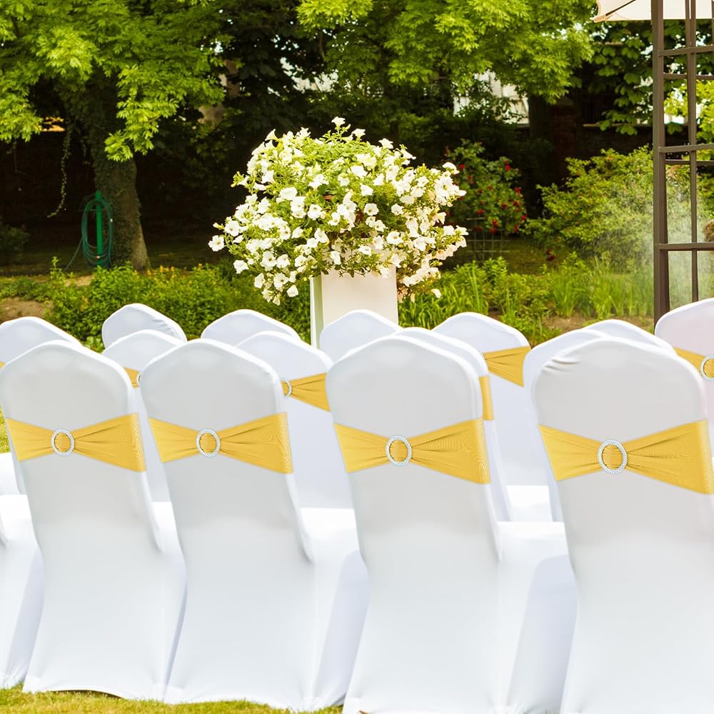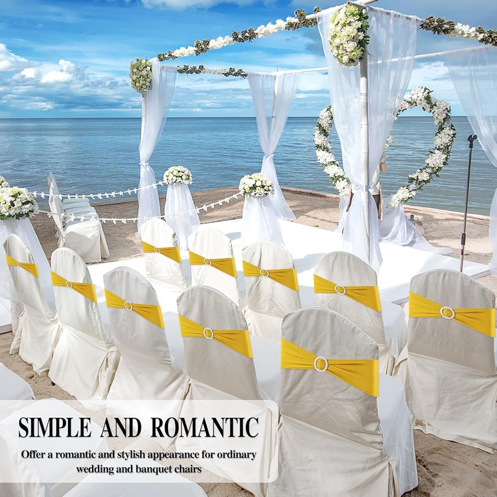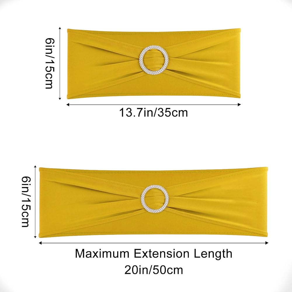Premium Stretch Fabric: Our chair sashes is made of 90% polyester and 10% spandex with a round 2.56 inch diameter silver buckle. The length of highly stretchable chair sash bands can be stretched to 19 inch, it can fit on most banquet chair or folding chair