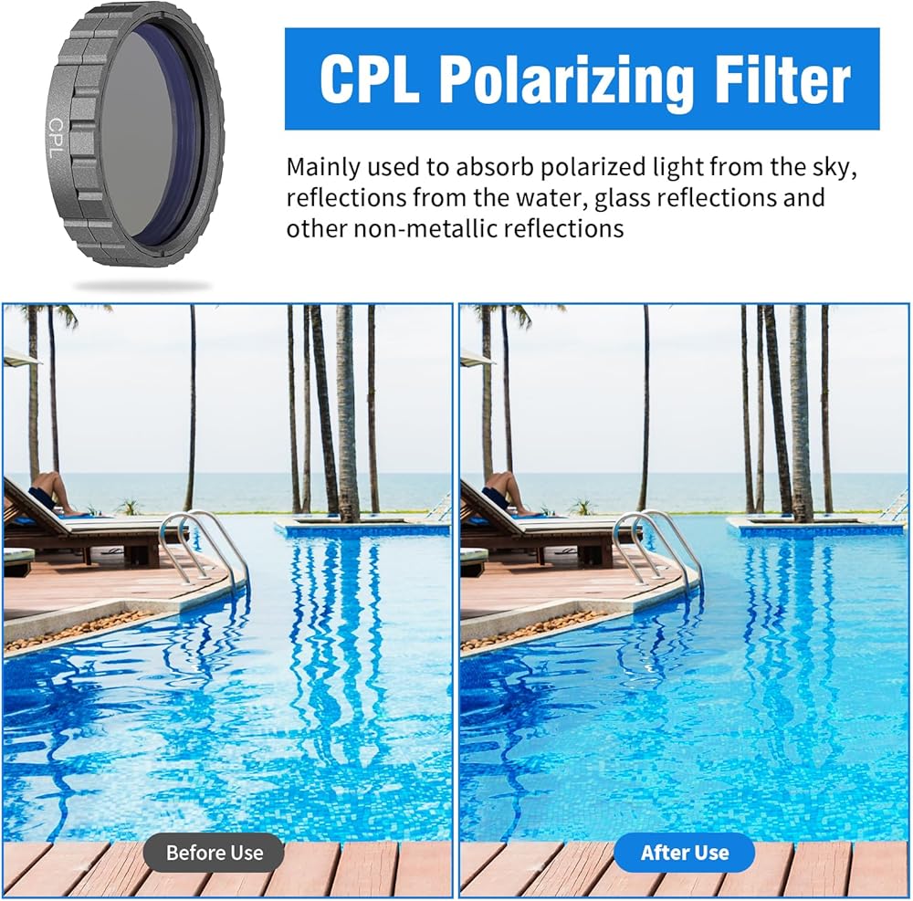 CPL Polarizing Filter: mainly used to absorb polarized light from the sky, reflections from water, glass reflections and other non-metallic reflections. When light is projected onto smooth surfaces such as water, glass, painted furniture, etc., it usually produces a strong single reflection, which can become a highlight in the image, and more highlights can affect the shot. The addition of CPL lenses improves the quality and sharpness of the image.