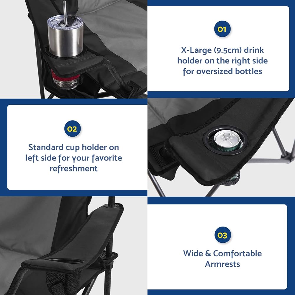 UNIQUE DESIGN: The double cup holders on this outdoor folding chair are different sizes. The left is a standard size for your favorite beverages, and the right is extra-large for larger bottles and beverages. Great folding camping chair for adults.