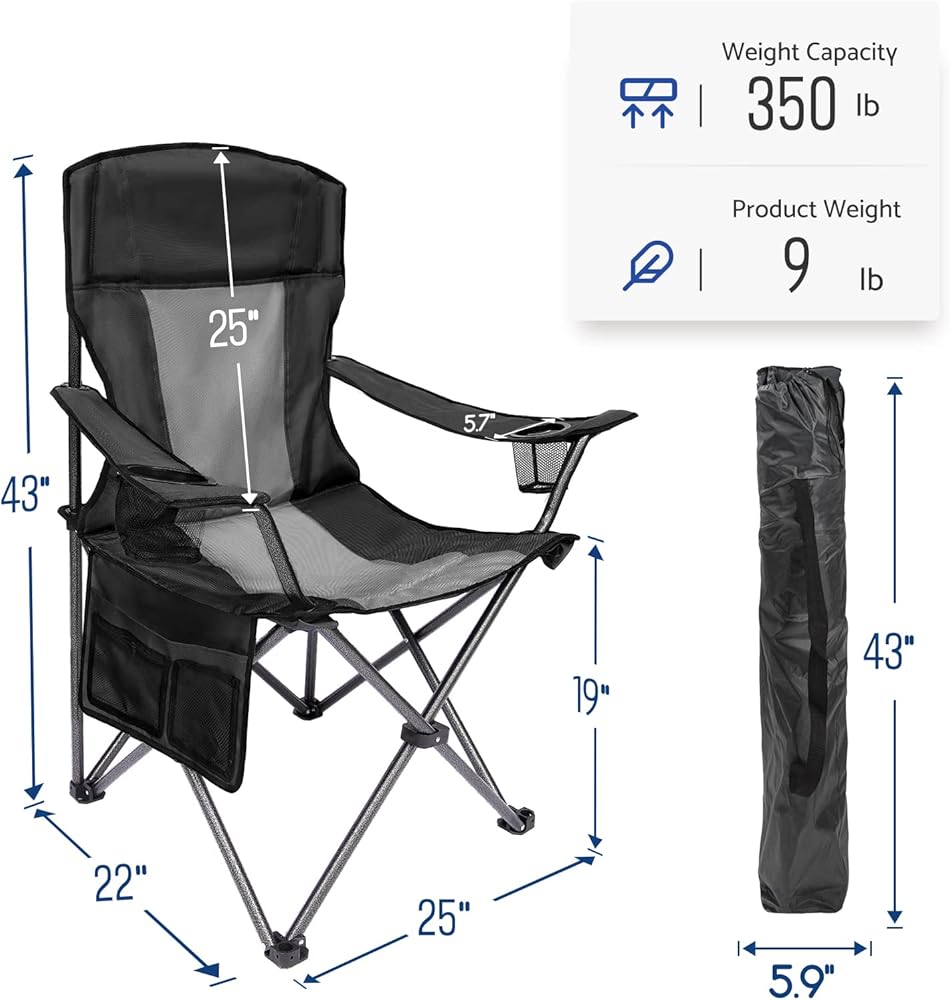 OVERSIZED AND STABLE: Large and strong, the adult camping chair's steel frame supports up to 350 lbs. The high back and wide seat are perfect for resting comfortably. Wide feet provide a stable platform. Outdoor Folding Chair is 25"W x 21.6" D x 43"H