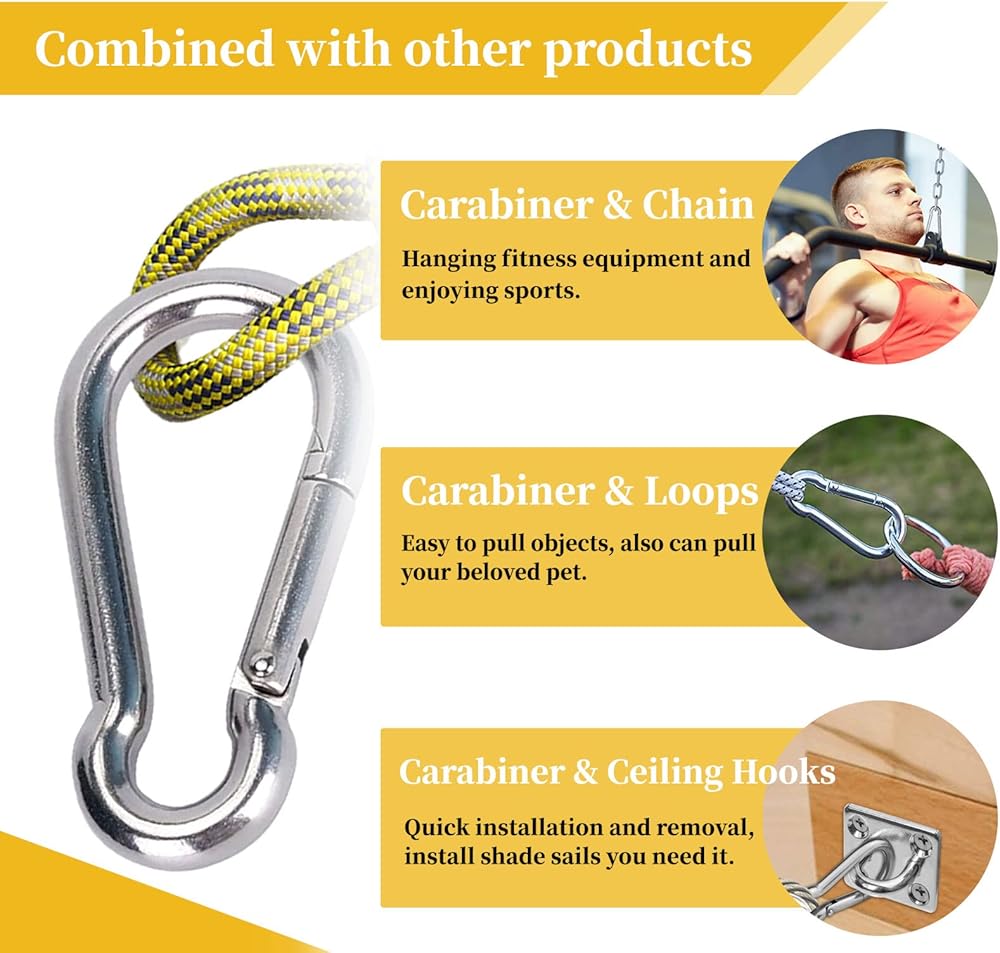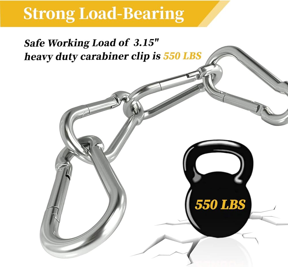 ✅ 【Safety Load 770 Pounds】- The Safe Working Load of each heavy duty carbine clip is 770 LBS (350KG), and the Breaking Load is 1500 LBS (700KG). Ideal for binding, rigging & anchoring hardware. These Stainless Steel Snap Hooks are perfect for Hammocks, Chairs, Baskets, Swings, Backpack, Key Ring, Chains, Ropes, Water Bottle, Camping, Hiking, Fishing, Dog Walking, Indoor/Outdoor Equipment Gear, DIY accessories.