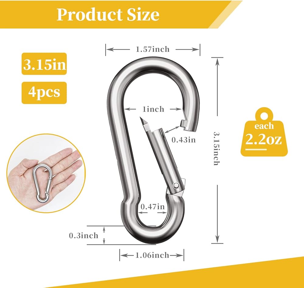 ✅ 【Specs & Features】- 4" Carabiner Hooks(4 Pcs) are included-Not For Climbing. Length: 4"; Width: 2"; Thickness: 0.38"; Max open width: 0.56"; Unit Weight: 4.3 ounces; Capacity: 770 LBS (350KG). Nice workmanship, no scratch, no sharp edges, no burrs and not hurting hands.