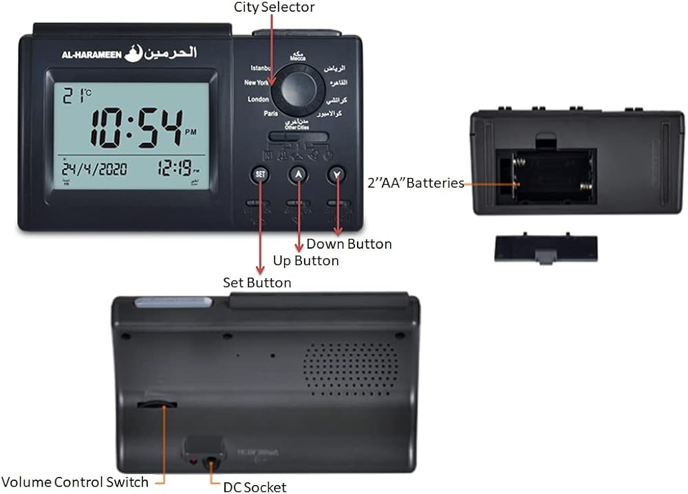 clock with a high quality azan sound for all prayers with azan volume control fitted in all clock models.