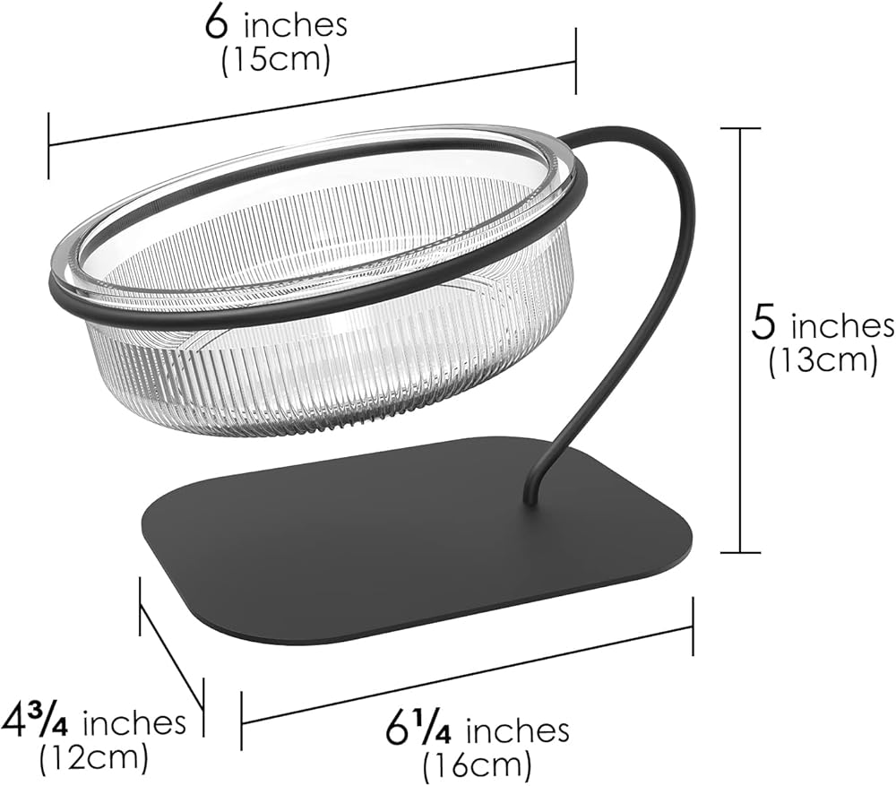 Cat food bowls dimensions: Iron holder dimensions: 6.3" x 4.7" x 5.1" (16cm x 12cm x 13cm); feeding bowls inner diameter: 5.9" (15cm)