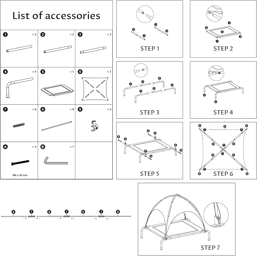 OUTDOORS & INDOORS USE: This outdoor dog bed is easy to assemble and disassemble, JOINT SPLICING, no need for screw installation. You can transport it easily and replace the Teslin mesh as needed. NOTICE: The dog bed must be installed in the order specified in the instructions.