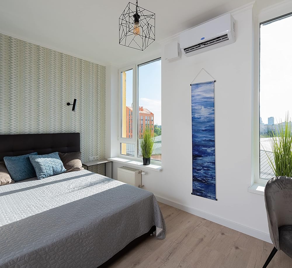 ظلال الأزرق والأبيض تخلق مظهرًا ساحليًا لافتًا للأنظار. هذا التصميم التجريدي الممتاز يسمح لك بجلب جمال الطبيعة في الحركة في الداخل.
