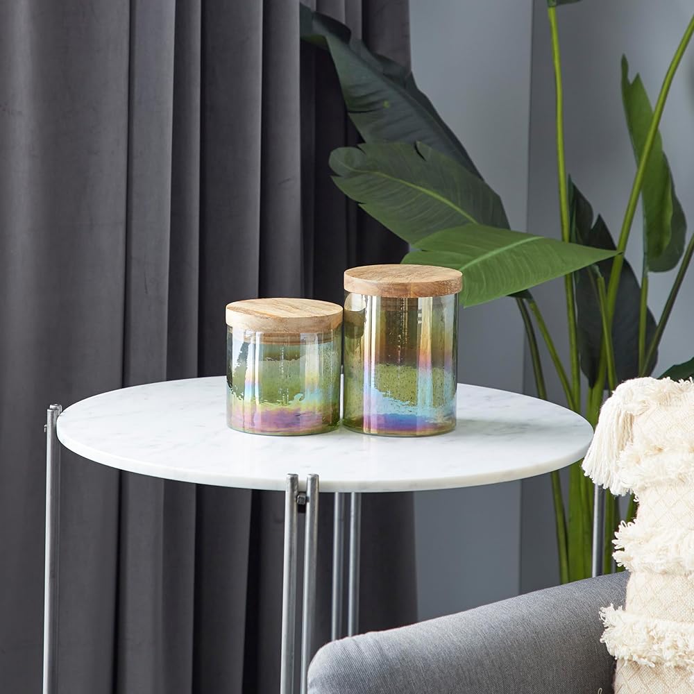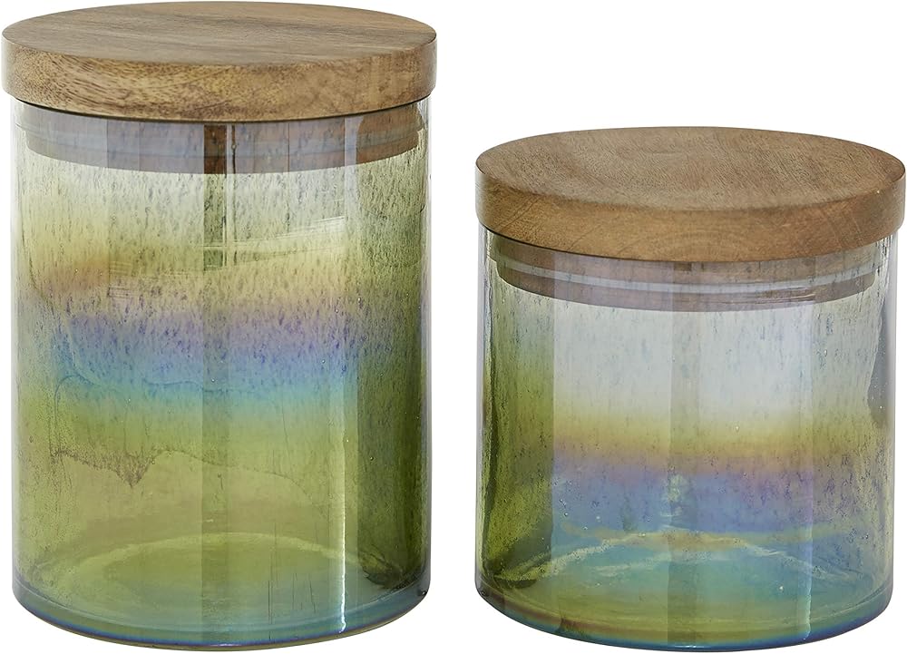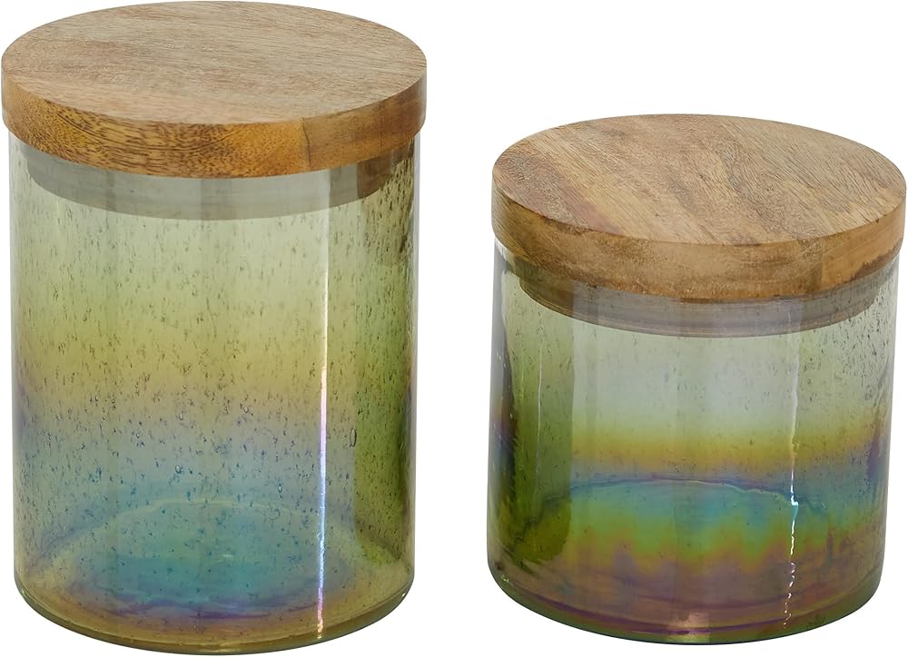 FEATURES CYLINDER DECORATIVE JARS: Pair of green iridescent glass cylinder jars with wooden lids, handblown glass construction with natural mango wood tops