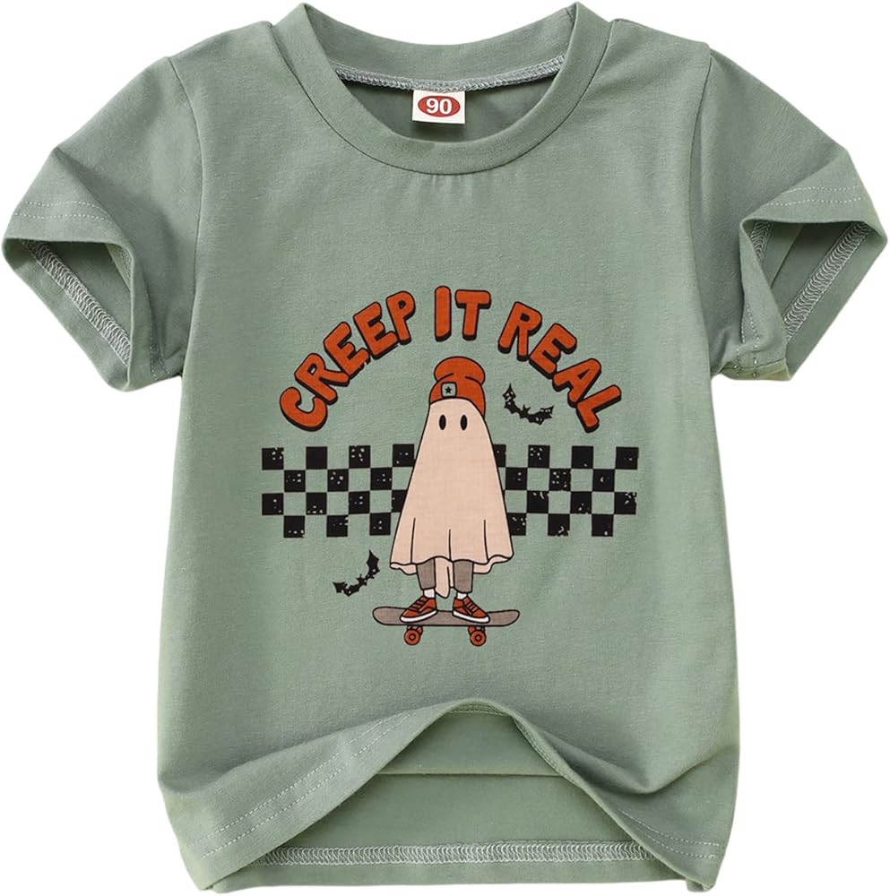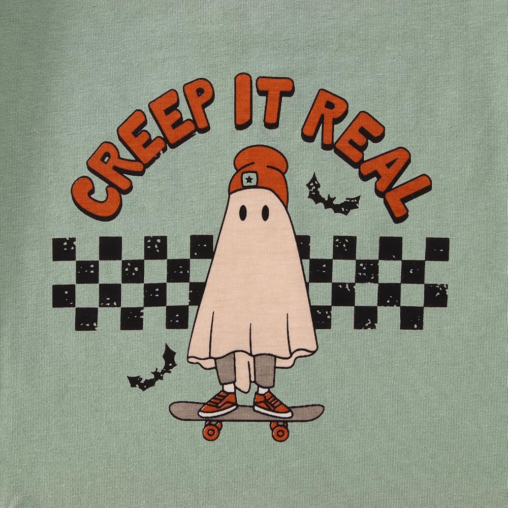 👻【Cute Ghost Skateboarding Print】: Creep it real toddler,Our ghost with skateboard toddler shirt is perfect for little ones who love Skateboarding and Halloween Day! Cute roller-skates ghouls spectre short sleeves t-shirt for toddler girls boys, short sleeves Halloween t-shirt, my first halloween baby girl outfit, "creep it real" letters printed, such an adorable Halloween ghost shirt for your toddler.