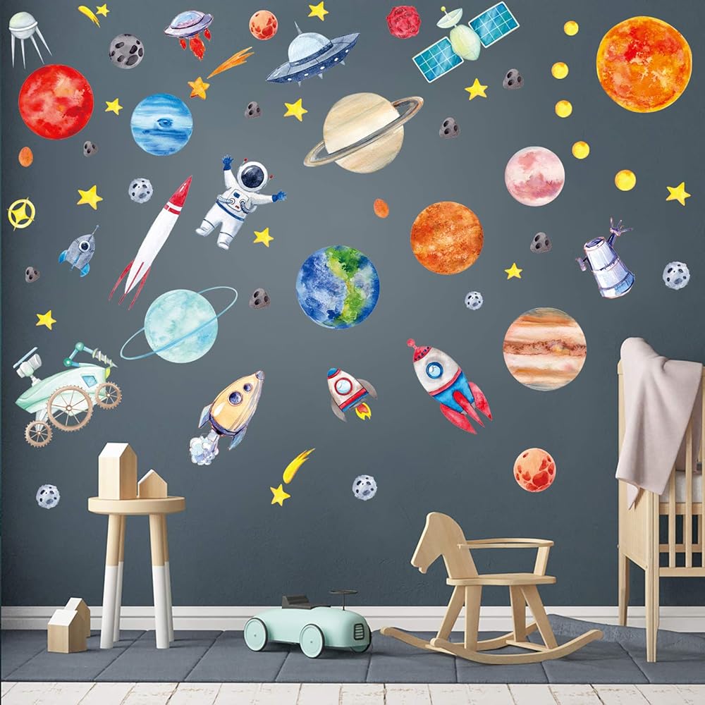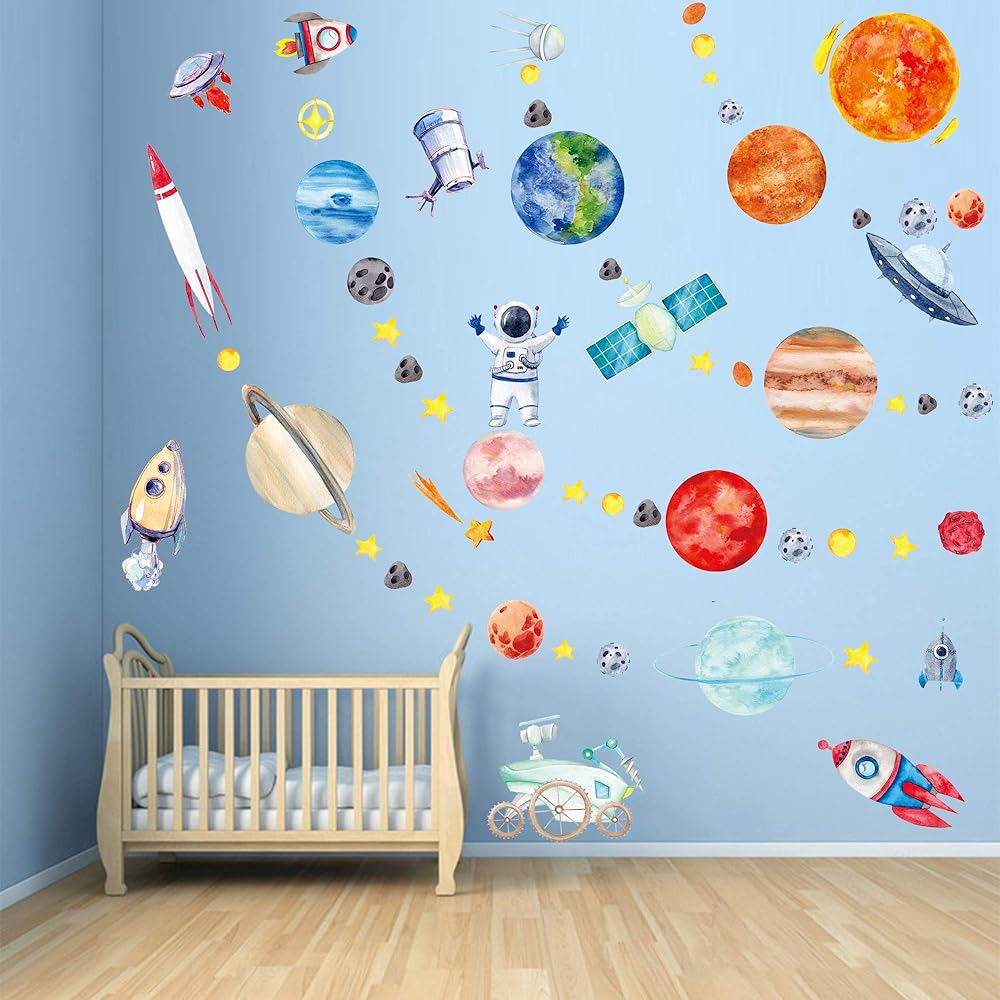 ملصقات حائط فضائية، ملصقات جدارية للكواكب ورائد فضاء وصاروخ ومركبة فضائية، ملصقات جدارية للنظام الشمسي ملصقات نجوم الكون المجرة للاطفال الاولاد والبنات الصغار ديكور غرفة نوم الحضانة